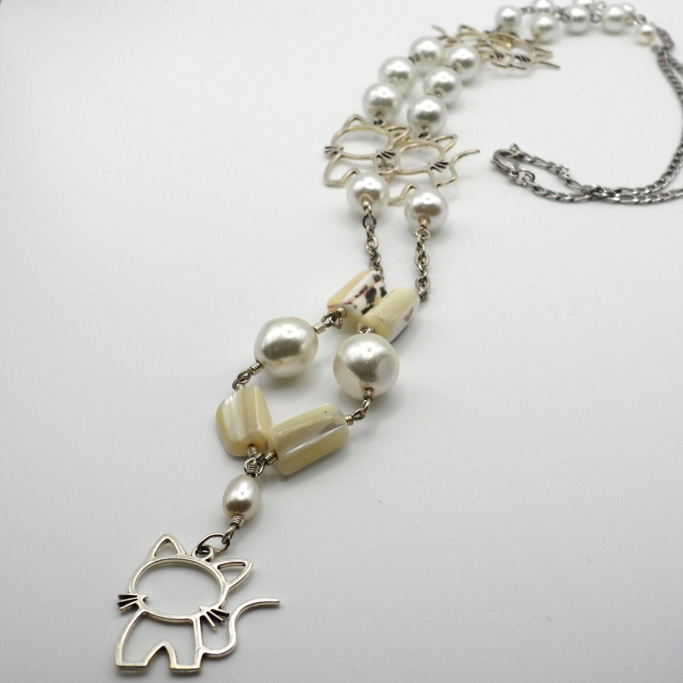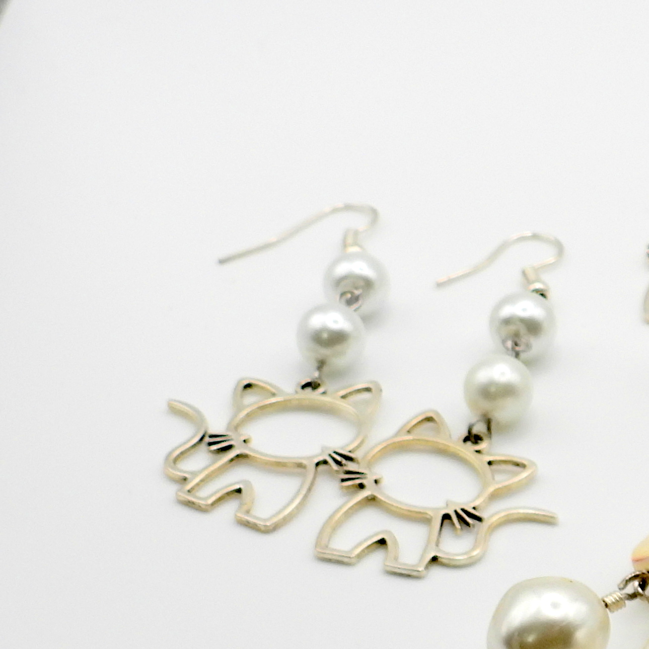 Kitten charm necklace with pearls and mother of pearl beads, on a wonderful full length necklace. Show off your unique fashion statement with these cute lil cat charms. Purrfect little kitty cats on the necklace and matching earrings.