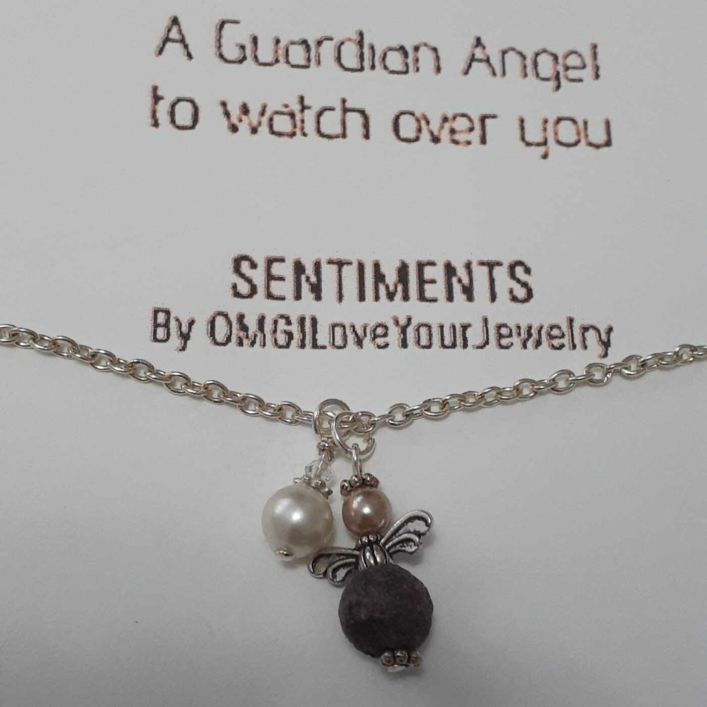Sentiments Collection ~ Sterling silver Guardian Angel Necklace with a Swarovski Pearl charm and angel handmade by me with pearl and a lava bead. A guardian angel to watch over you. The sterling silver necklace measures 18.5 inches long but I can make it to suit. Please contact me.