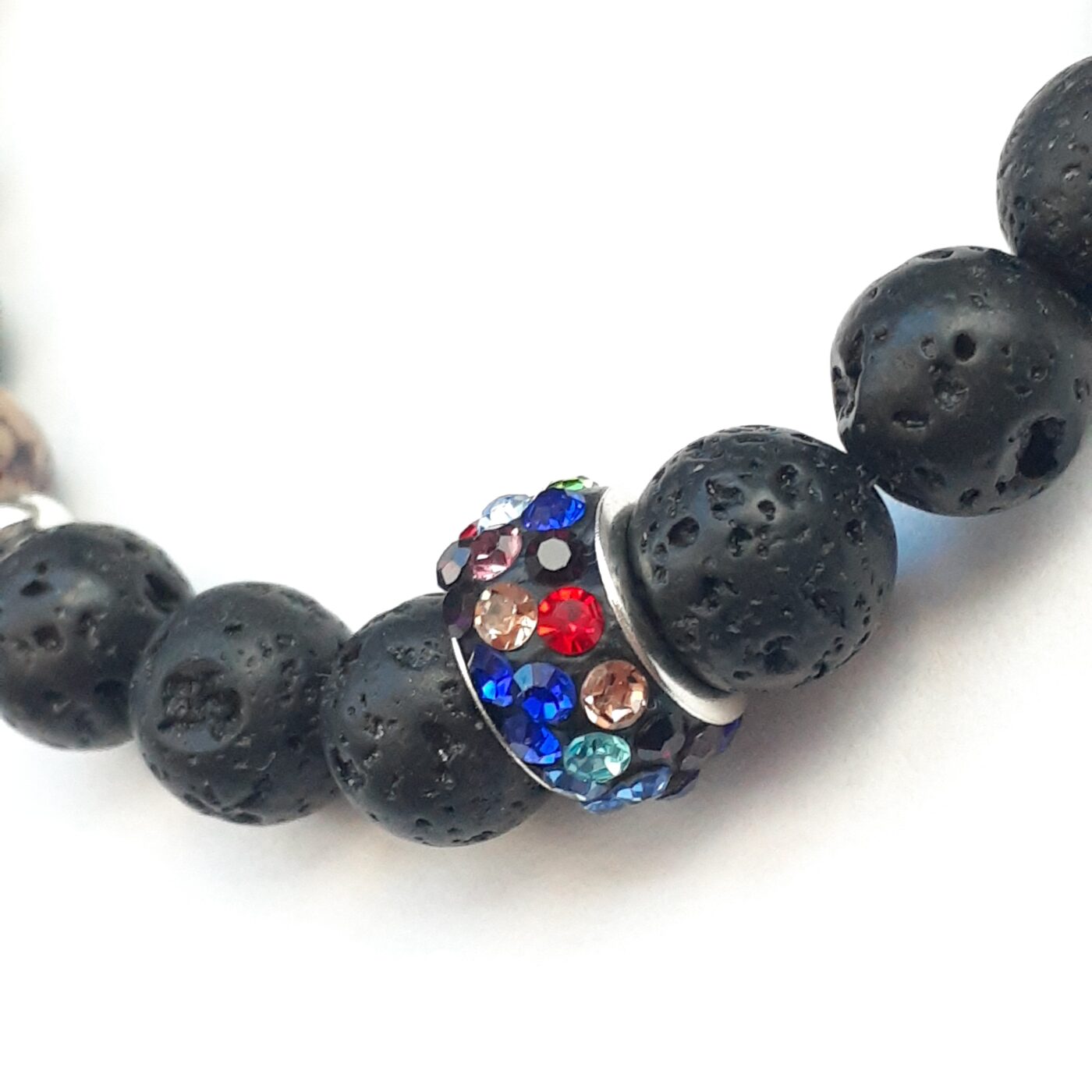 This lava bead stretch bracelet sports a “Bling Bling” colourful rhinestone-encrusted metal focal bead, and colourful stone beads. It combines natural porous volcanic rock with high-shine glamour. It is a fashion accessory and a personal essential oil diffuser. Simply apply a drop or two of your favourite essential oils or perfume onto the porous lava beads. Make certain the oil used is safe on your skin. Lava bead bracelets are popular for the modern look, and blends raw textures with sparkling, eye-catching elements. Lava stone is known for it’s grounding and calming properties; the energy of mother earth’s core and volcanoes. Wearing a lava rock bracelet is earthy, promotes feelings of stability emotional balance, security, and peace.