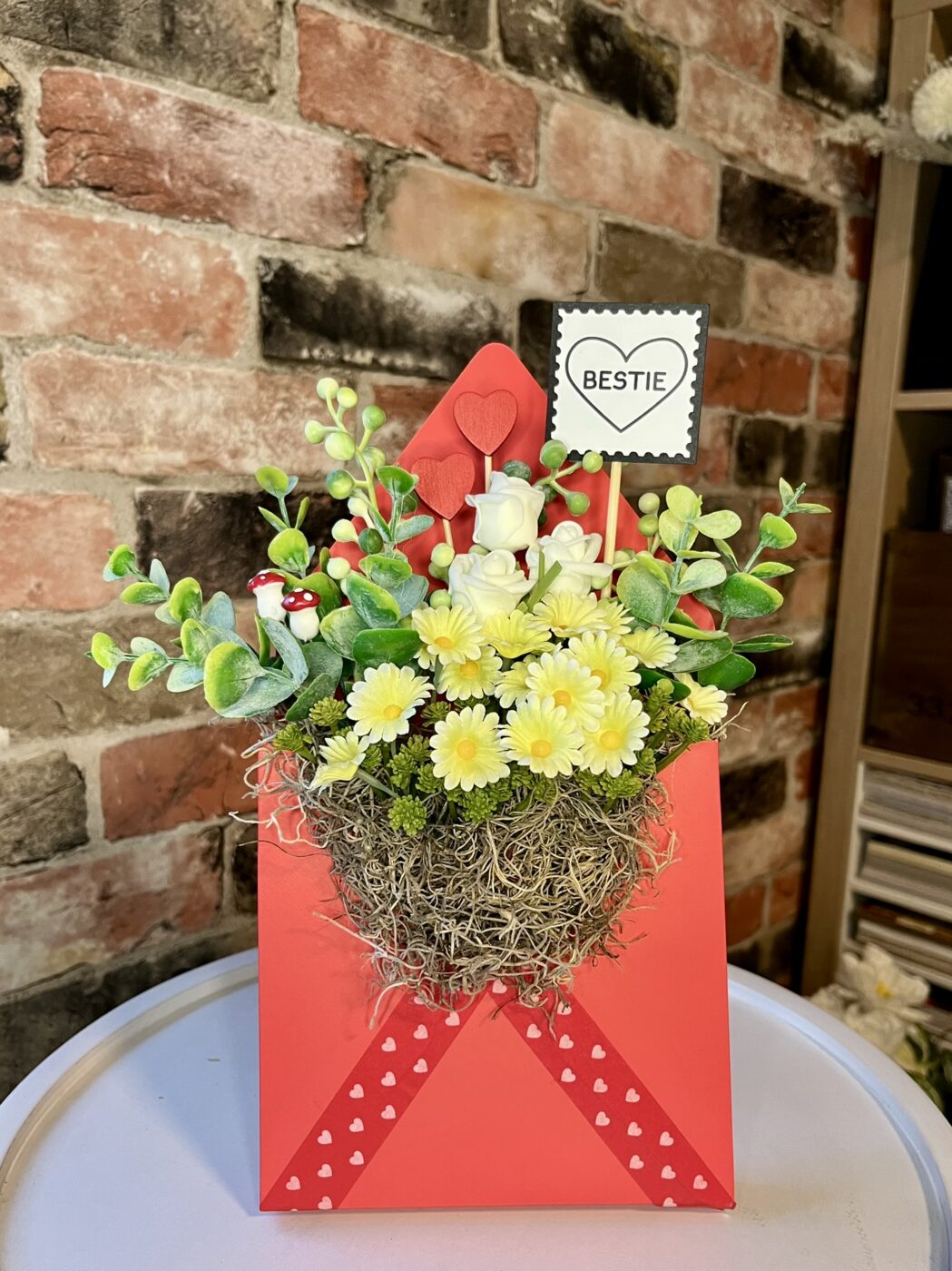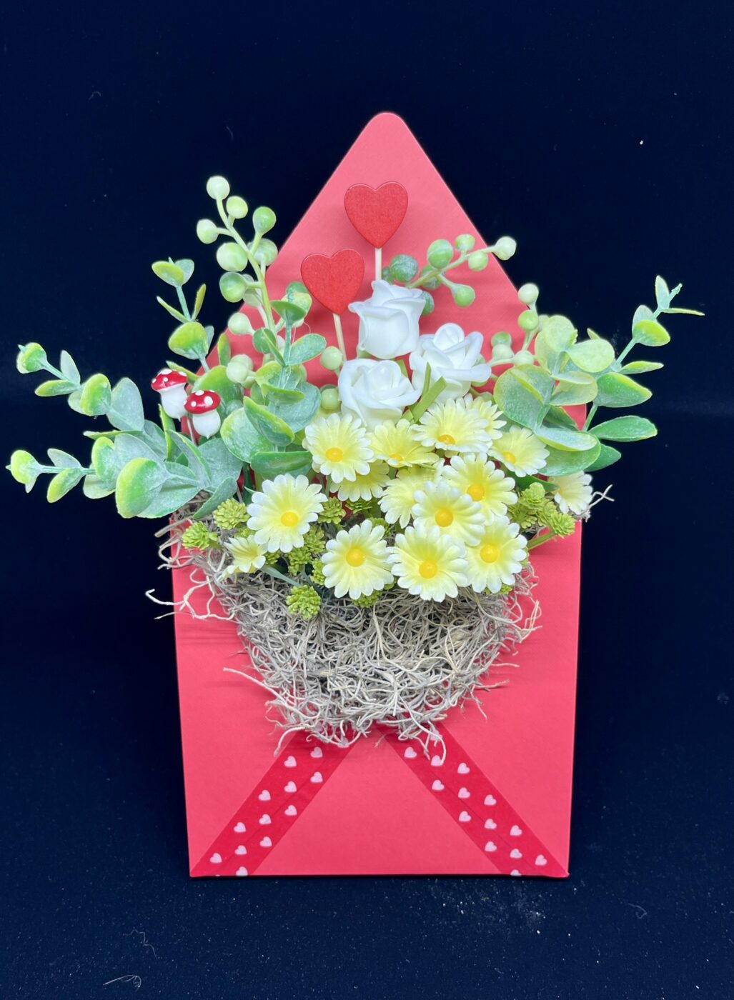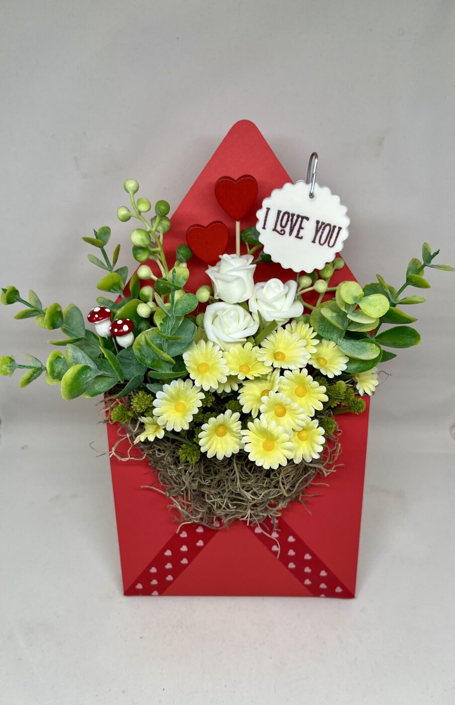 The idea for the Love Letter Collection grew from my love of old letters, pretty paper, and fun floral designs. Each unique envelope “pocket” is made from premium paper and filled with a rich variety of faux floral and greenery, which keeps their message of love long-lasting. Perfect for a breath of fresh décor or as a thoughtful, one-of-a-kind gift for Valentine’s Day, birthdays, or simply thinking of you.The Love Letter arrangement has an integrated stand allowing it to sit upright on a desk, shelf, table or window ledge.