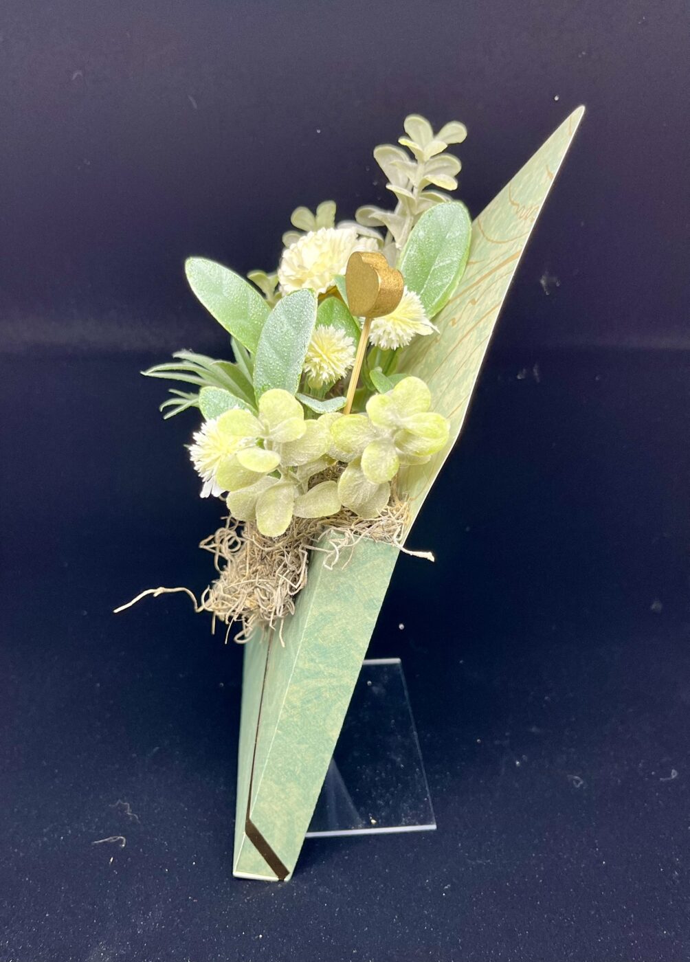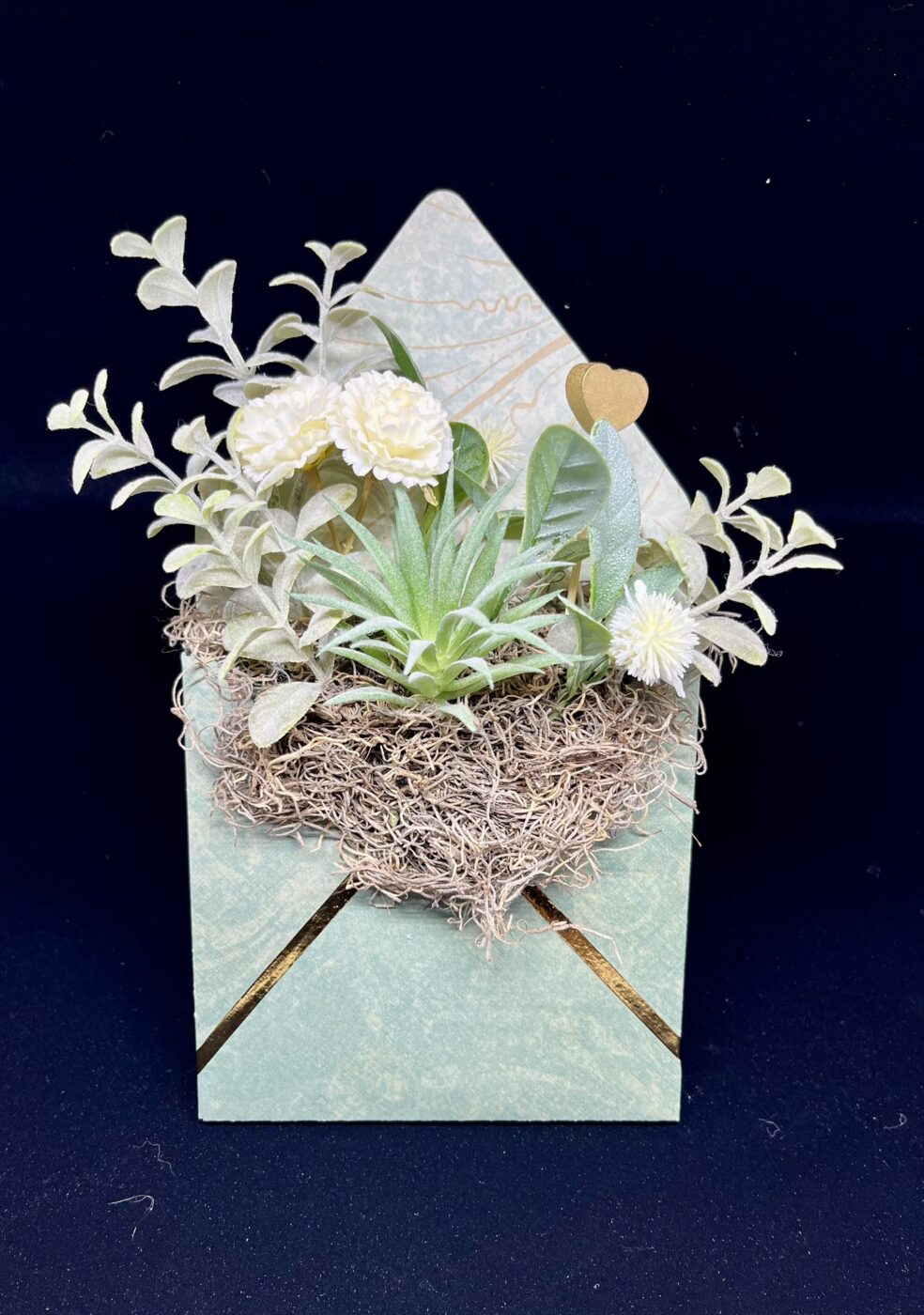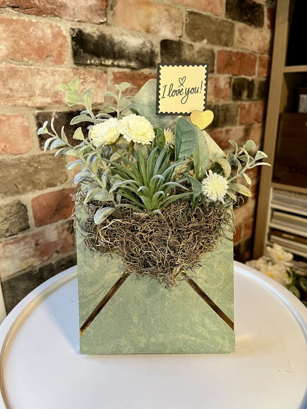 The idea for the Love Letter Collection grew from my love of old letters, pretty paper, and fun floral designs. Each unique envelope “pocket” is made from premium paper and filled with a rich variety of faux floral and greenery, which keeps their message of love long-lasting. Perfect for a breath of fresh décor or as a thoughtful, one-of-a-kind gift for Valentine’s Day, birthdays, or simply thinking of you.The Love Letter arrangement has an integrated stand allowing it to sit upright on a desk, shelf, table or window ledge.