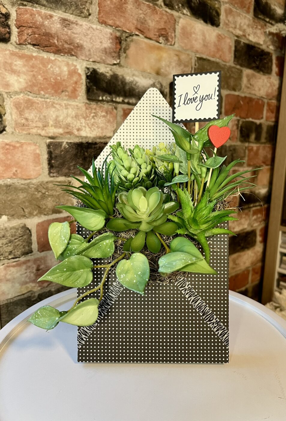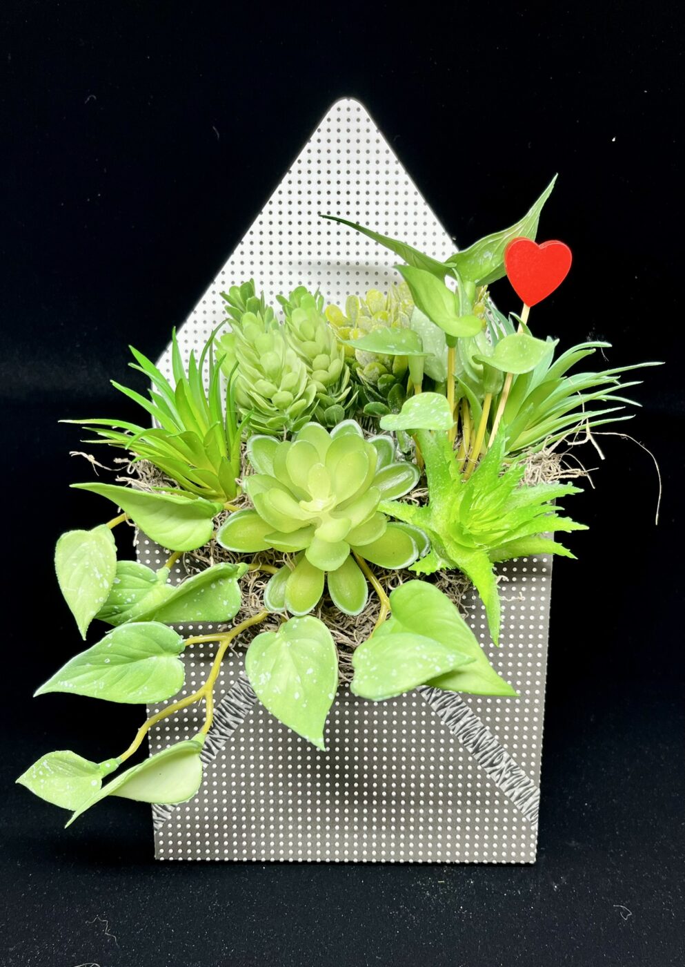 The idea for the Love Letter Collection grew from my love of old letters, pretty paper, and fun floral designs. Each unique envelope “pocket” is made from premium paper and filled with a rich variety of faux floral and greenery, which keeps their message of love long-lasting. Perfect for a breath of fresh décor or as a thoughtful, one-of-a-kind gift for Valentine’s Day, birthdays, or simply thinking of you.The Love Letter arrangement has an integrated stand allowing it to sit upright on a desk, shelf, table or window ledge.
