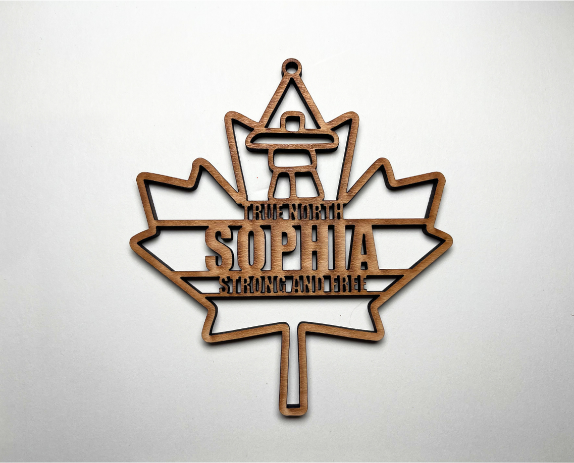 This maple leaf ornament features an inukshuk and the iconic tagline, “True North Strong and Free.”