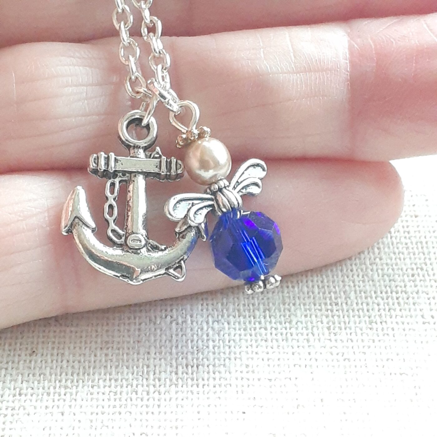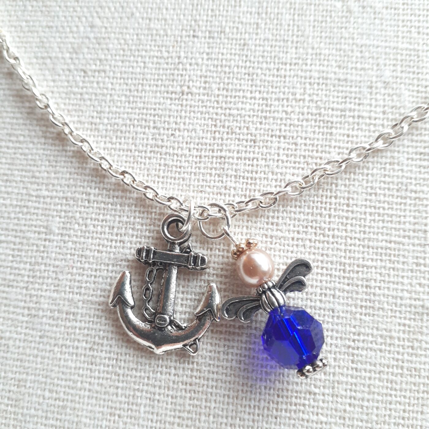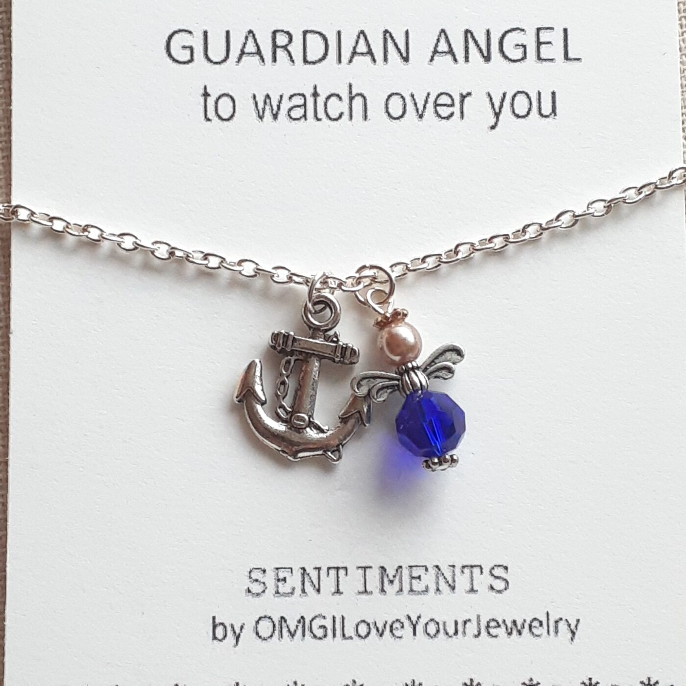 Sentiments Collection ~ Sterling silver Guardian Angel Necklace with a detailed 3D nautical charm and angel handmade by me with pearl and Czech crystals. A guardian angel to watch over you. The sterling silver necklace measures 18.5 inches long but I can make it to suit. Please contact me.