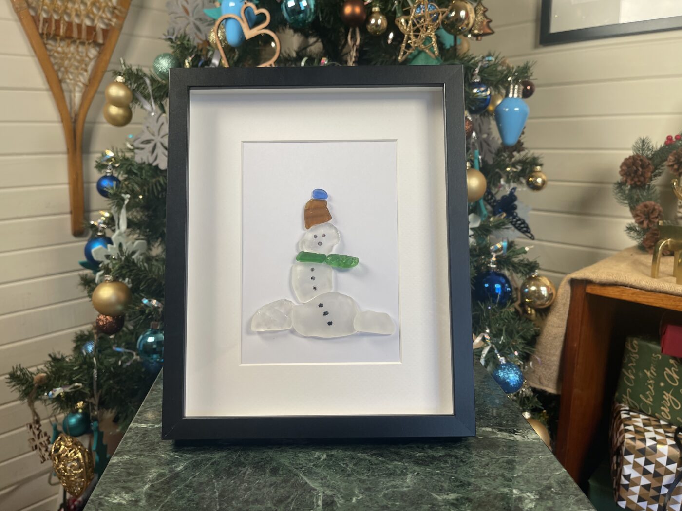 How adorable is this snowman that is slowly melting away? Made of seaglass from Lake Erie with a small rare blue piece included. All the pieces fit so perfectly together to form our melting snowman. Perfect piece to celebrate the season!