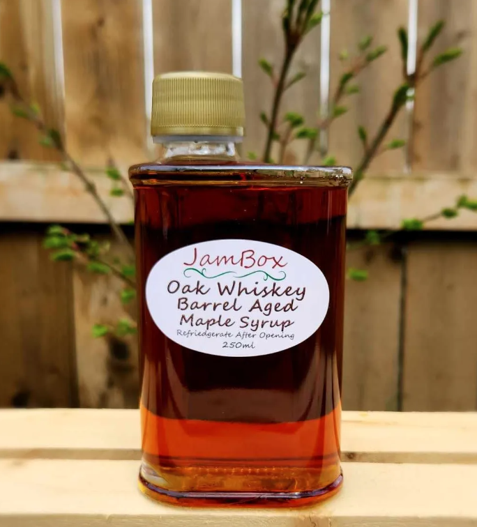 Hints of Oak and a rustic smokey whiskey flavour. Our maple syrup ages for about 6 months air sealed in an old oak whiskey barrel that has been used to house whiskey for generations! Taking on notes of Oak, Whiskey and our delicious Ontario Maple Syrup. 0% Alcohol