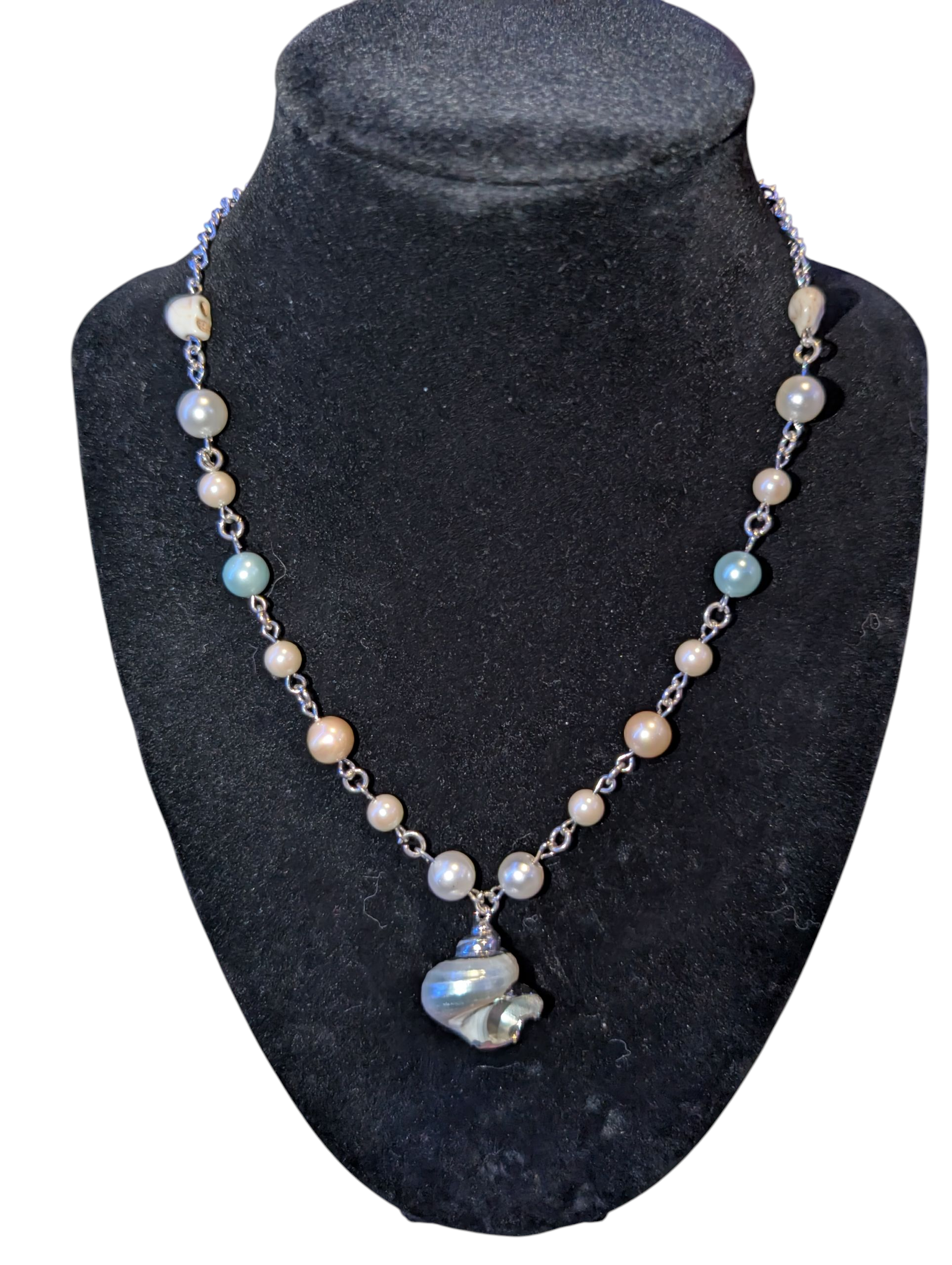Ocean radiance features a Shell pendant with various shades of pearls. This piece will bring the ocean with you, no matter where you go. Made in Silver.