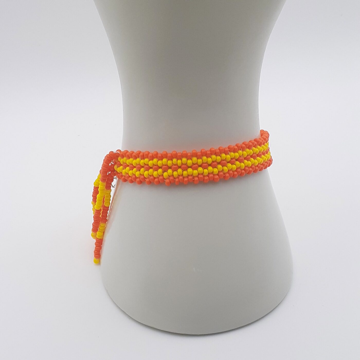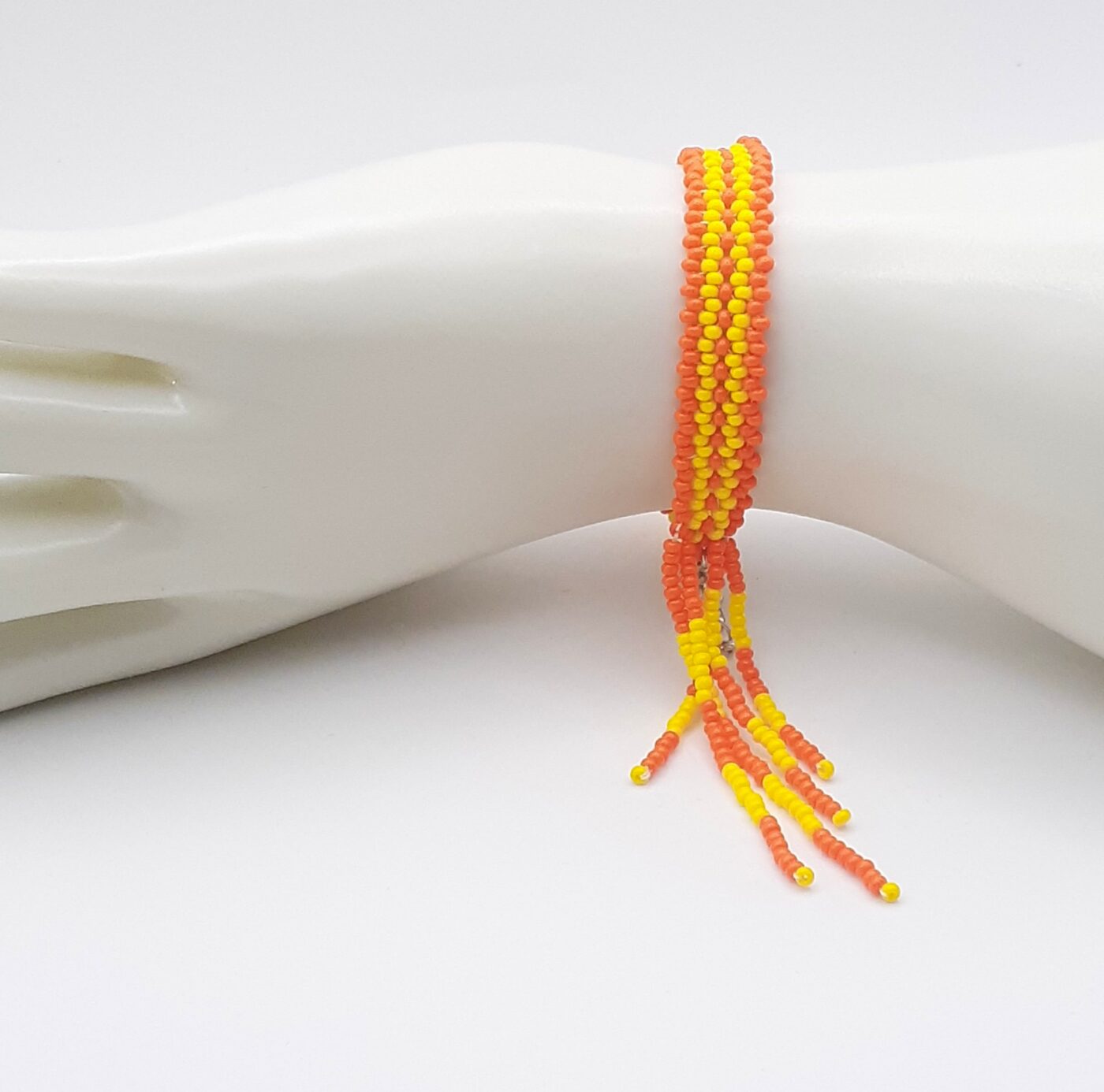 Supple flowing beaded orange beaded bracelet. The texture of this bracelet is immediately noticeable. It drapes so incredibly nice on your wrist. The fringe is a signature feature I developed to add uniqueness and it not only adds a special designer touch, but it also covers the clasp and extender chain.This one-of-a-kind beaded bracelet measures 6 inches. So unique. So OMG!