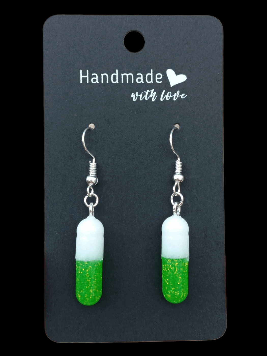 Handmade pill capsule earrings made out of resin, perfect for those who work in pharmacy or medical settings.