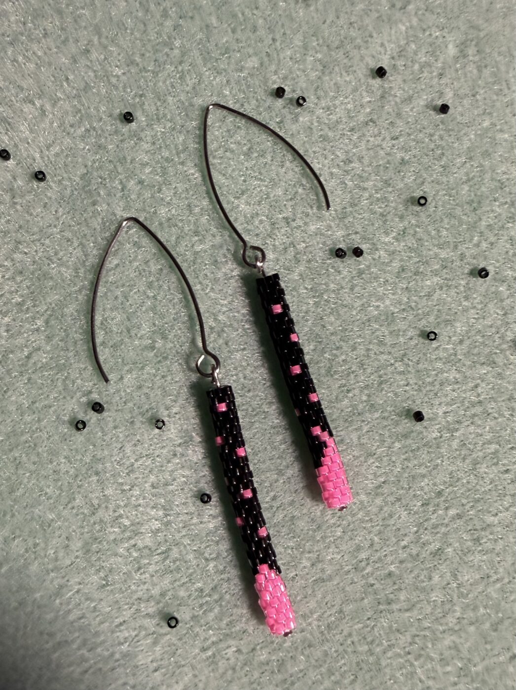 These hand-beaded earrings feature pink and black beads and measure approximately 1.75″ long.