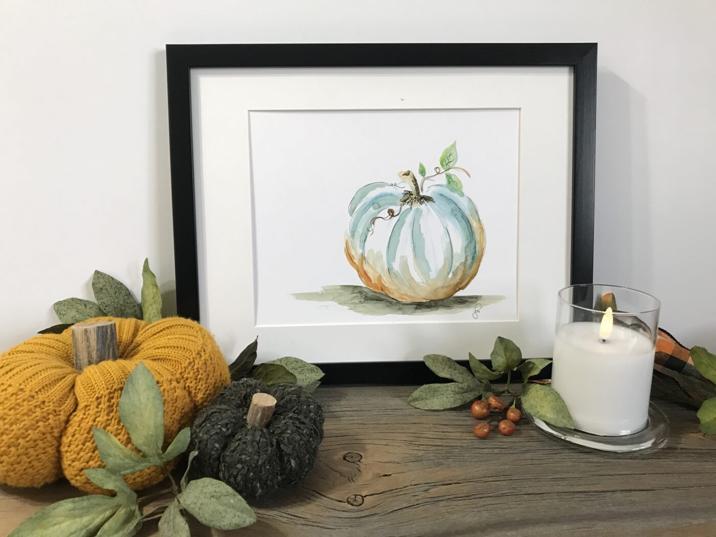 Part of my Autumn Collection. This piece captures the soft and cozy colours of Autumn, featuring a charming pumpkin in Autumn tones.  Such a perfect decor piece for the harvest season and beyond. Micron ink pen and watercolour design.