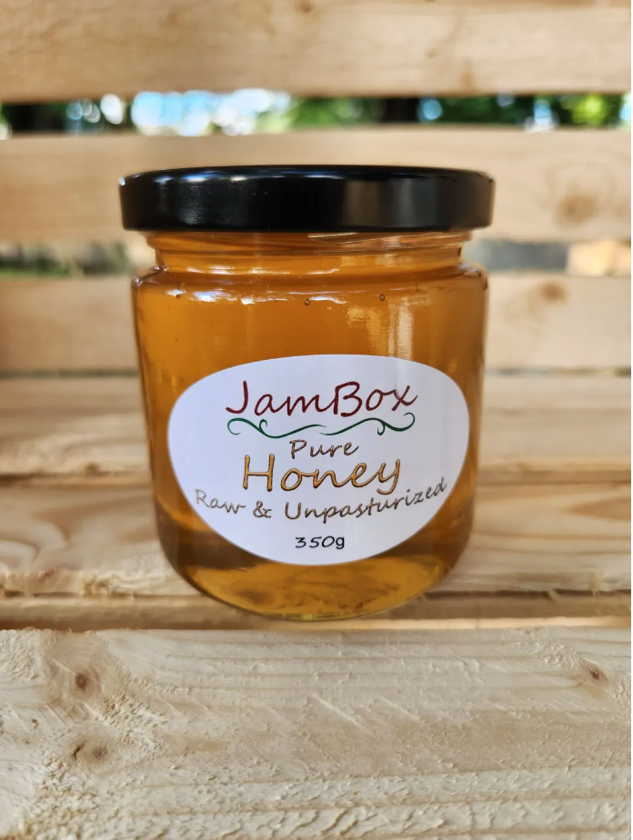 100% Pure & Natural, Raw, Unpasteurized Honey 350g. Jam Box is proud to offer 100% Local, farm-fresh honey. Our honey goes directly from the comb into your jar.