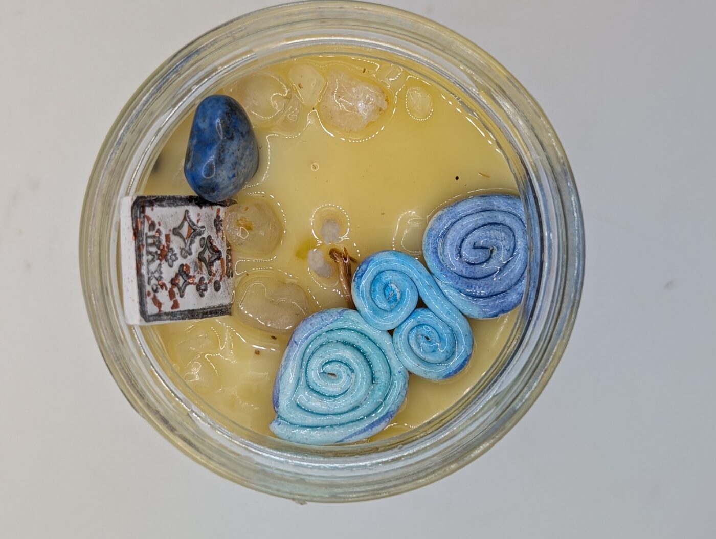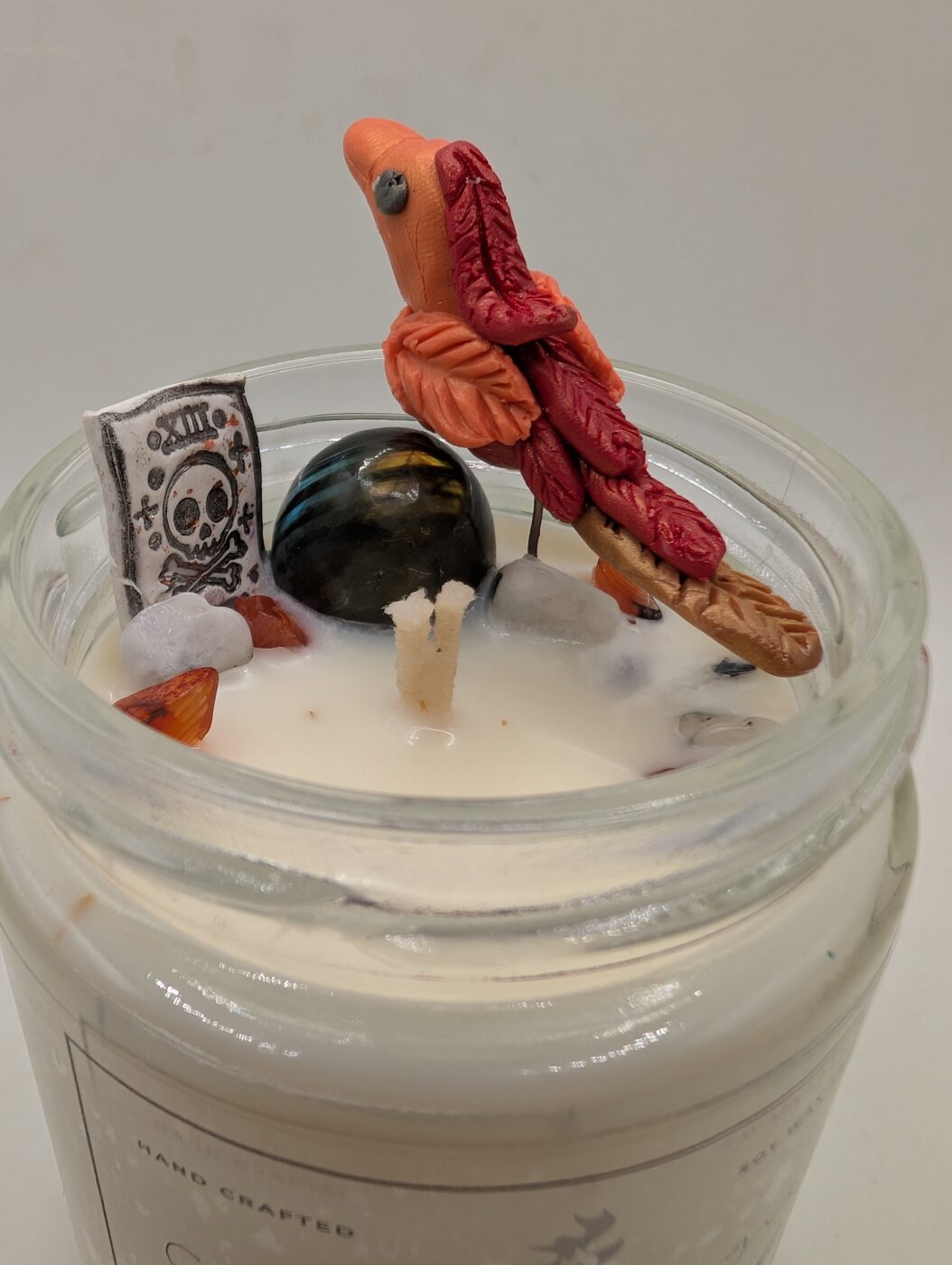 Each candle is topped with authentic crystals and a handcrafted polymer clay adornment.