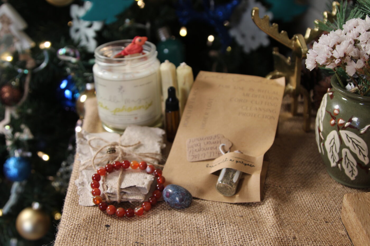 These gift sets offer a variety of tools to be used in your personal spiritual or magical practices. Including a 7oz soy wax candle, two handcrafted soy/beeswax blend chime candles, handcrafted petition paper, journal adornments and an intuitively chosen crystal.