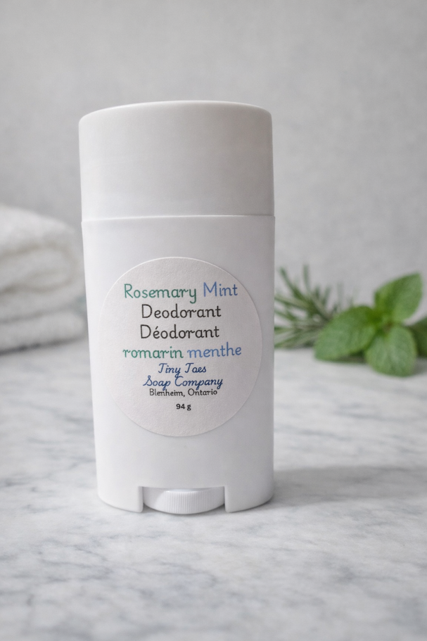 Fresh rosemary and peppermint essential oils create a clean, herbal scent with a subtle cooling finish. Arrowroot powder helps absorb moisture, while beeswax, shea butter, and coconut oil provide a smooth glide that applies comfortably and wears well throughout the day.