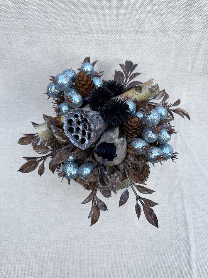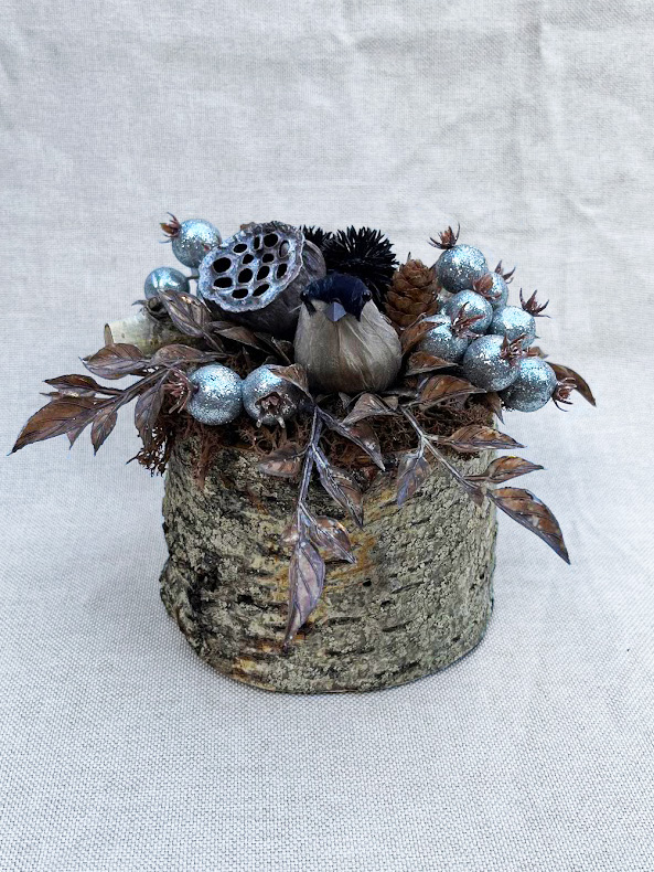This design features faux plants in a silvery brown tone surrounding a little bird all tucked in by a birch branch. The real birch chunk base makes it look like you could have found this whole scene in the woods.