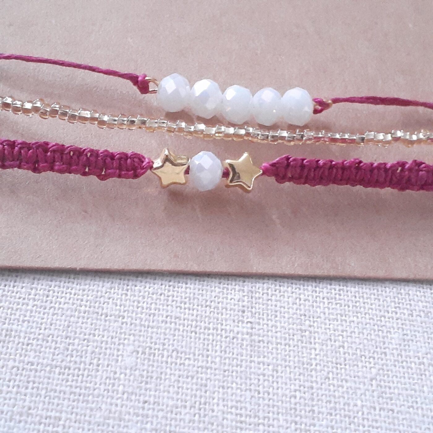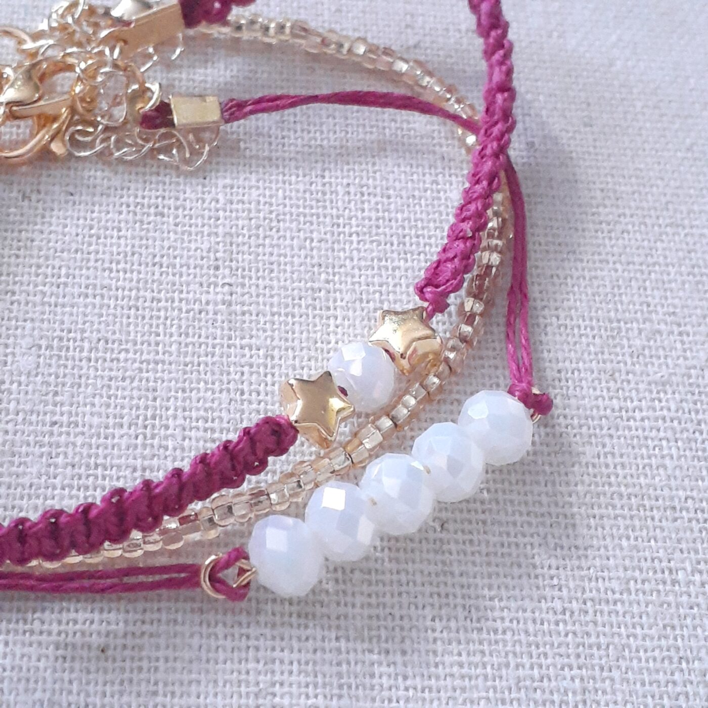 Set of 3 Fushia Pink Thin Beaded Macrame Cord Bracelets