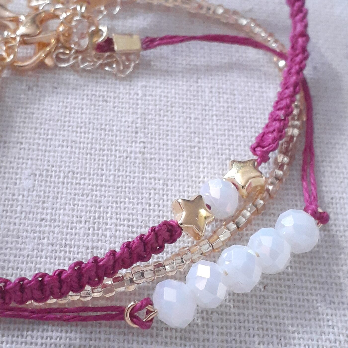 A vibrant set of fushia pink thin bracelets that are striking together or absolutely fabulous worn individually. The macrame bracelet is made with hemp cord, gold metal stars, and a faceted crystal focal bead. The second bracelet of the set is also made with hemp cord and the same faceted crystals in the middle offering loads of sparkle to its design. The third bracelet is made entirely of gold crystal seed beads and also boasts lots of sparkle and shine. This set of 3 thin bracelets will fit 6.5 inches to 8 inches. An great stacked bracelet set of arm candy.