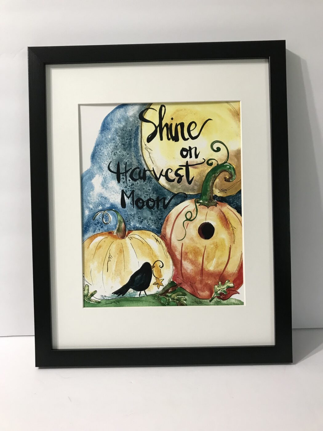 Part of my Autumn Collection. A beautiful piece that incorporates the traditional, warm tones of Autumn, within the beautiful pumpkins, while also giving a mystical feel with the moon and crow. The message: “Shine On Harvest Moon” adds a nice final touch. This makes for a beautiful piece for the harvest season and beyond. Micron ink pen and watercolour design.