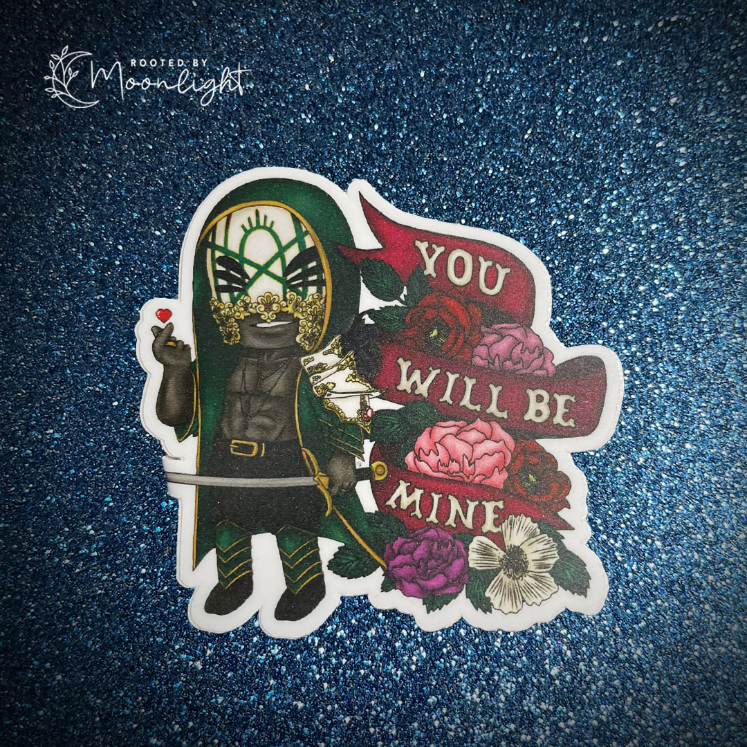 Fan art of Vessel, the lead singer of Sleep Token in sticker form. He’s his Even in Arcadia gear, making a heart with his fingers and the lyrics “You Will Be Mine” from Mine beside him circled in flowers. Sleep Token is one of my favourite bands, their lyrics, sound and the drama with the costumes. I’m here for all of it. I intend to draw more, especially Jerry the flamingo. Stay tuned for more.