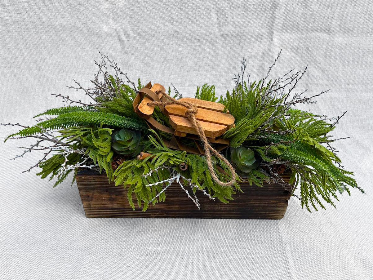 This wintery centrepiece features a cute wooden sleigh resting on faux greenery, with glistening twigs, pine cones and few touches of cinnamon. Arranged in a locally handmade wood box, this is a perfect décor piece for the whole winter season.