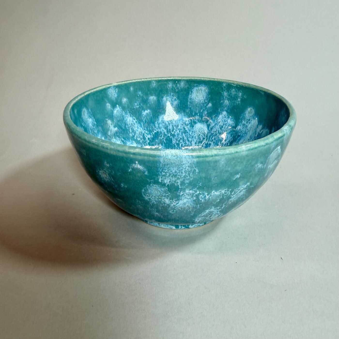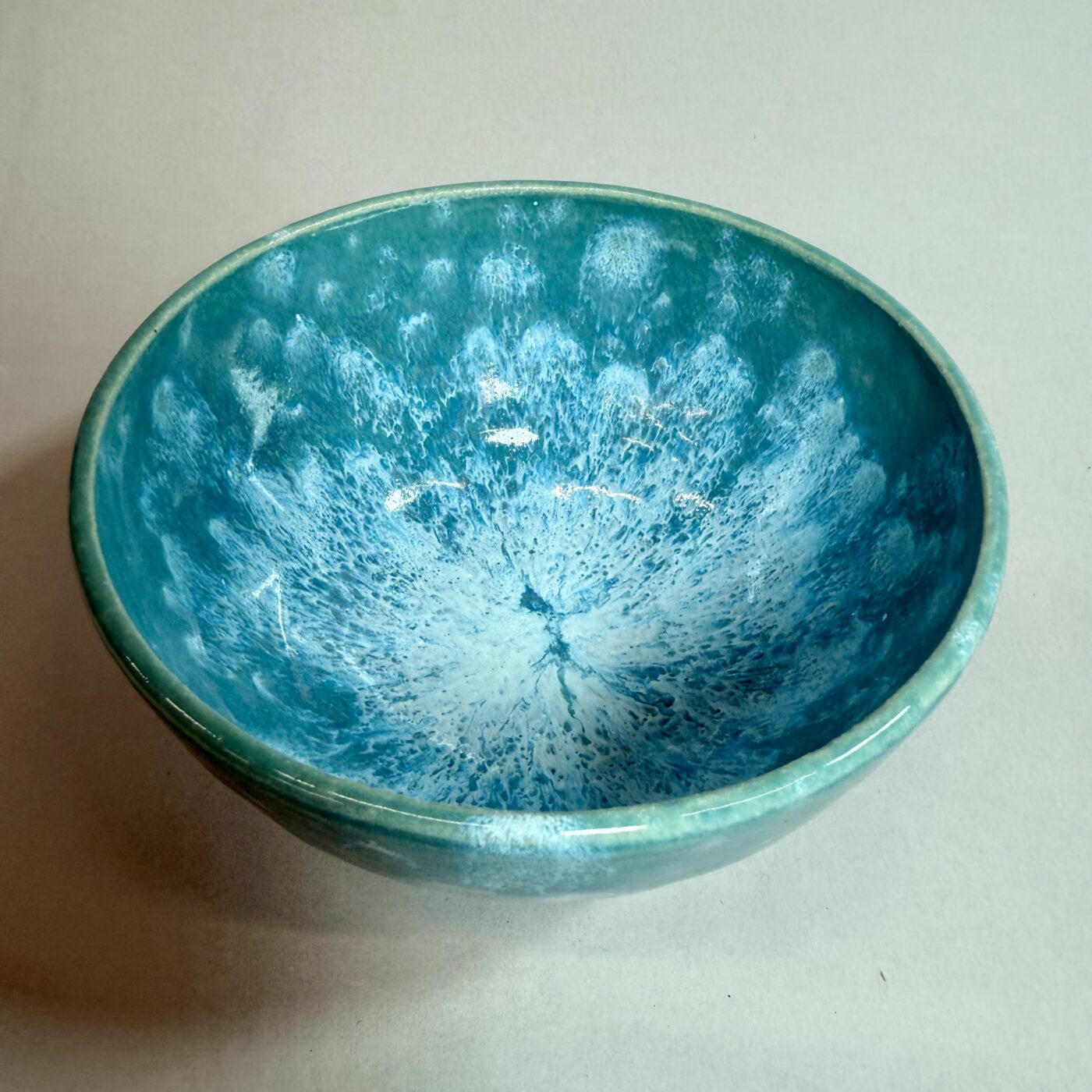 This bowl has been wheel thrown and glazed with drippy light blue variegation. This is a smaller version of the larger bowl,  without the sandy exterior.