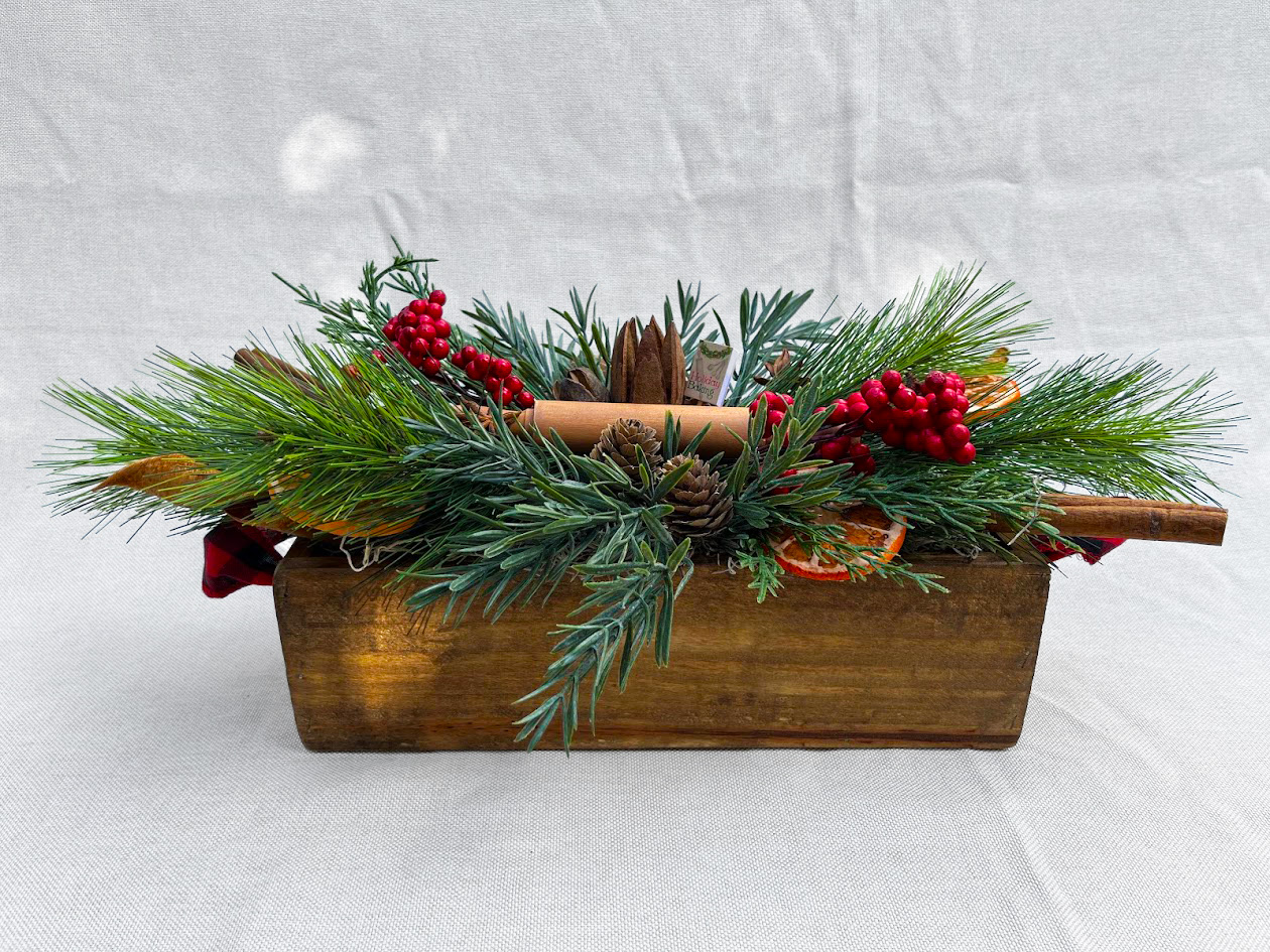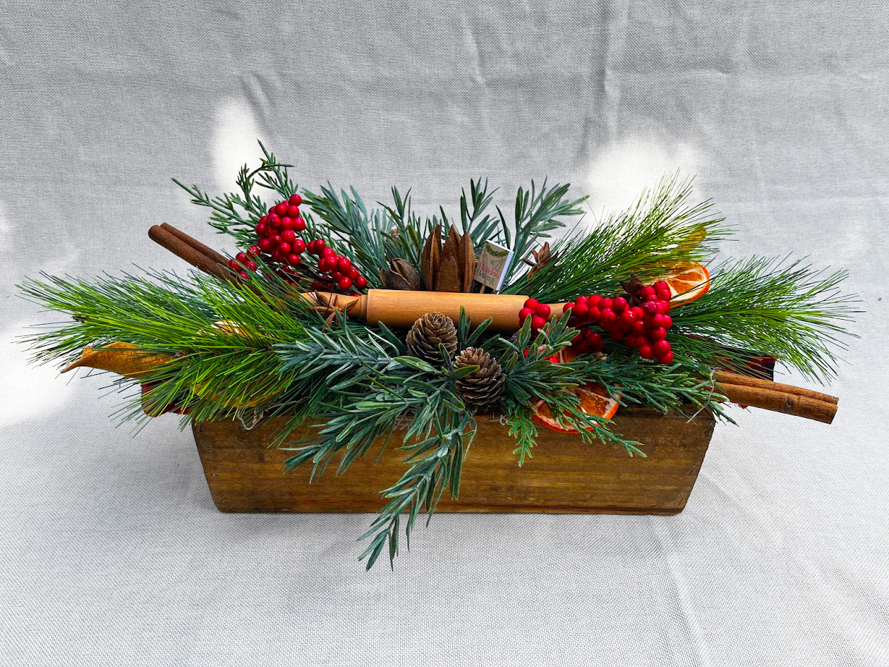 Can’t you just smell the cinnamon in this sweet Christmas arrangement? Tucked into this locally handmade rustic wood box is a wintery assortment of cinnamon sticks, star anise, faux dried oranges, lovely greenery & berries all topped off with a mini rolling pin and even a tiny recipe book. It’s simply yummy.