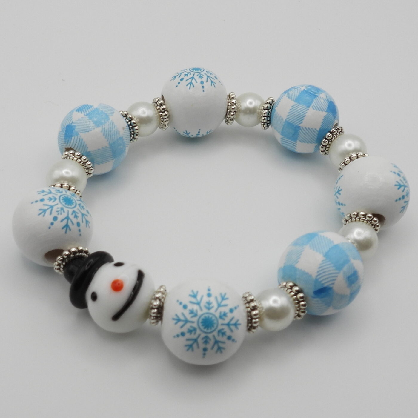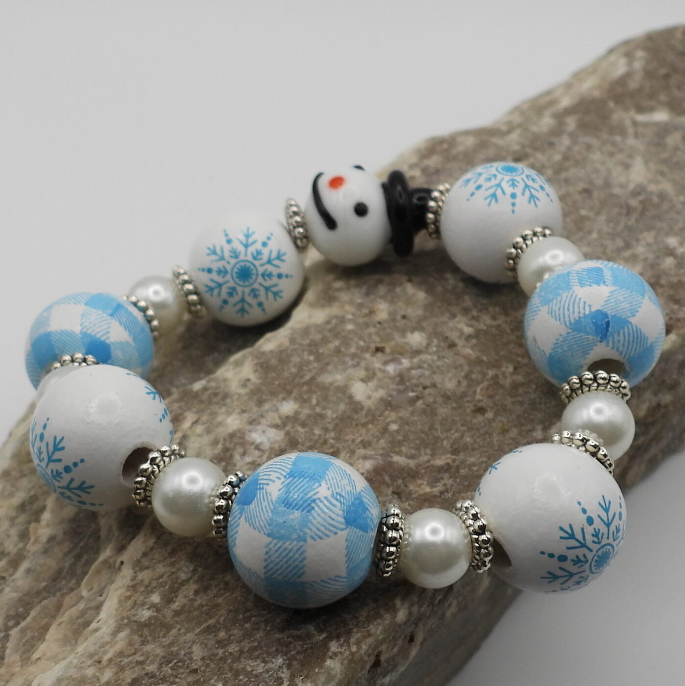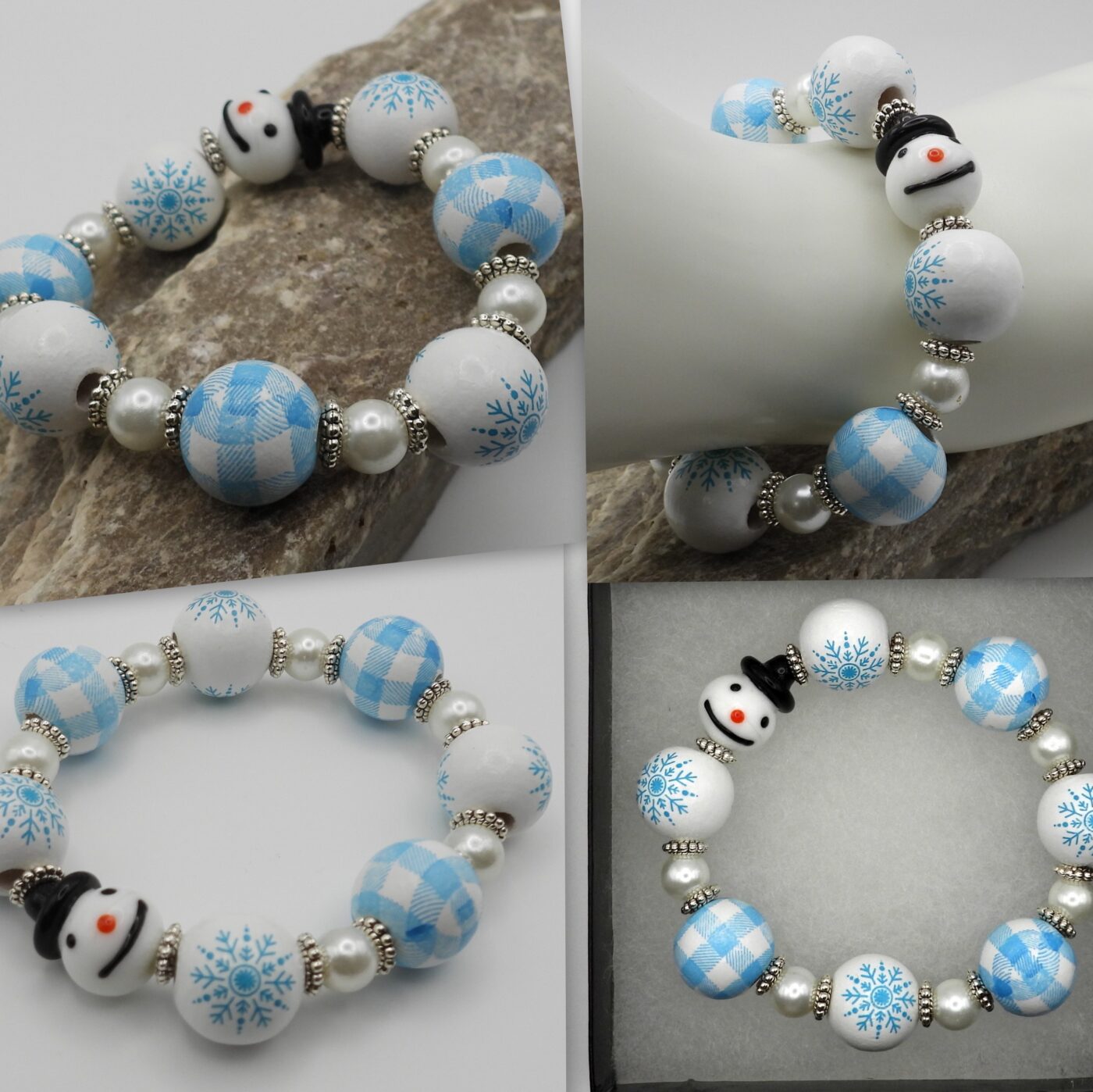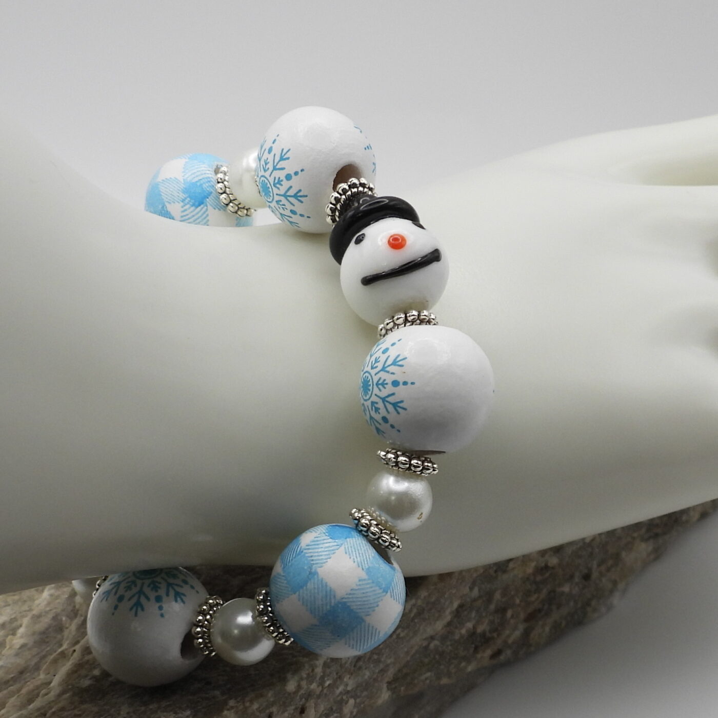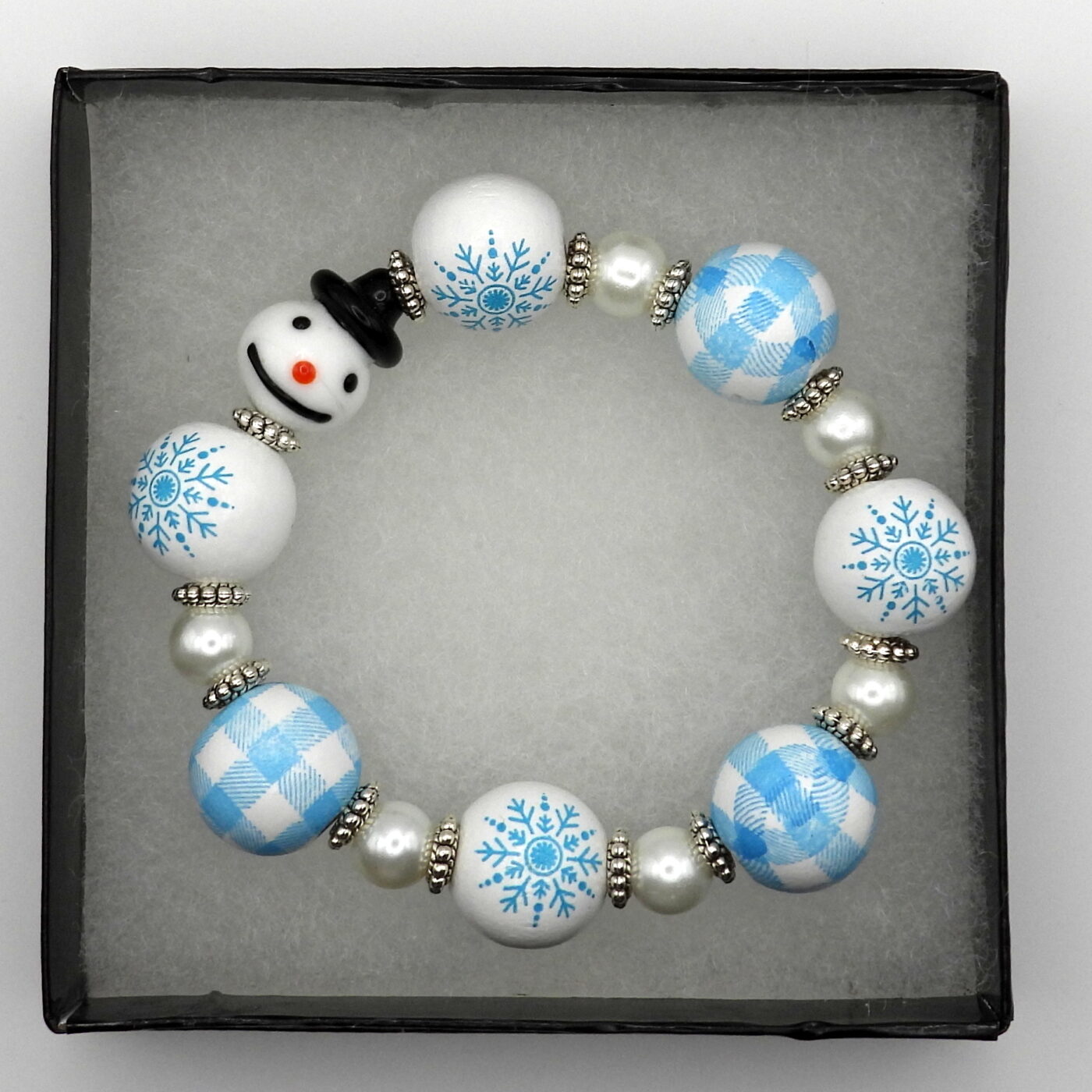 The cutest little snowman lampwork bead in this bracelet, with all the snowflake beads around it, will make it a very special bracelet to own or gift to someone. It measures 7 inches