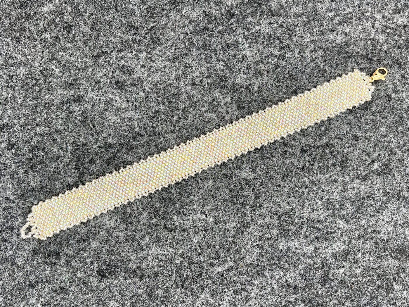 This Solas (Light) hand-beaded bracelet measures 7″ x 0.5″