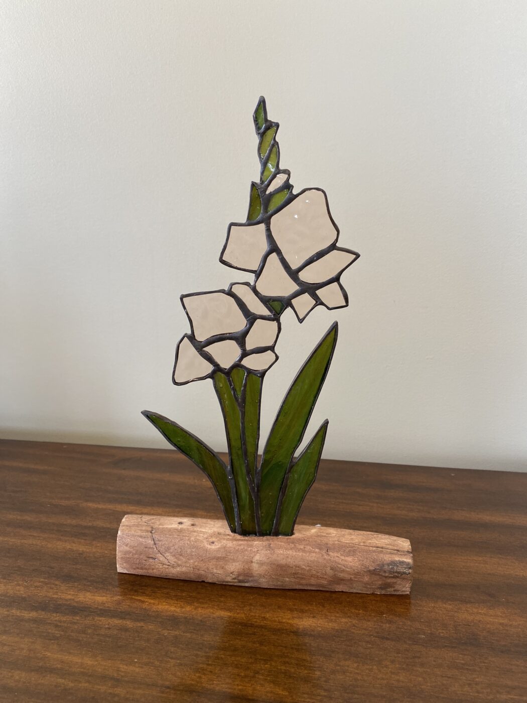 Stained Glass Gladiolus Inlaid on Driftwood Base –  Light Pink