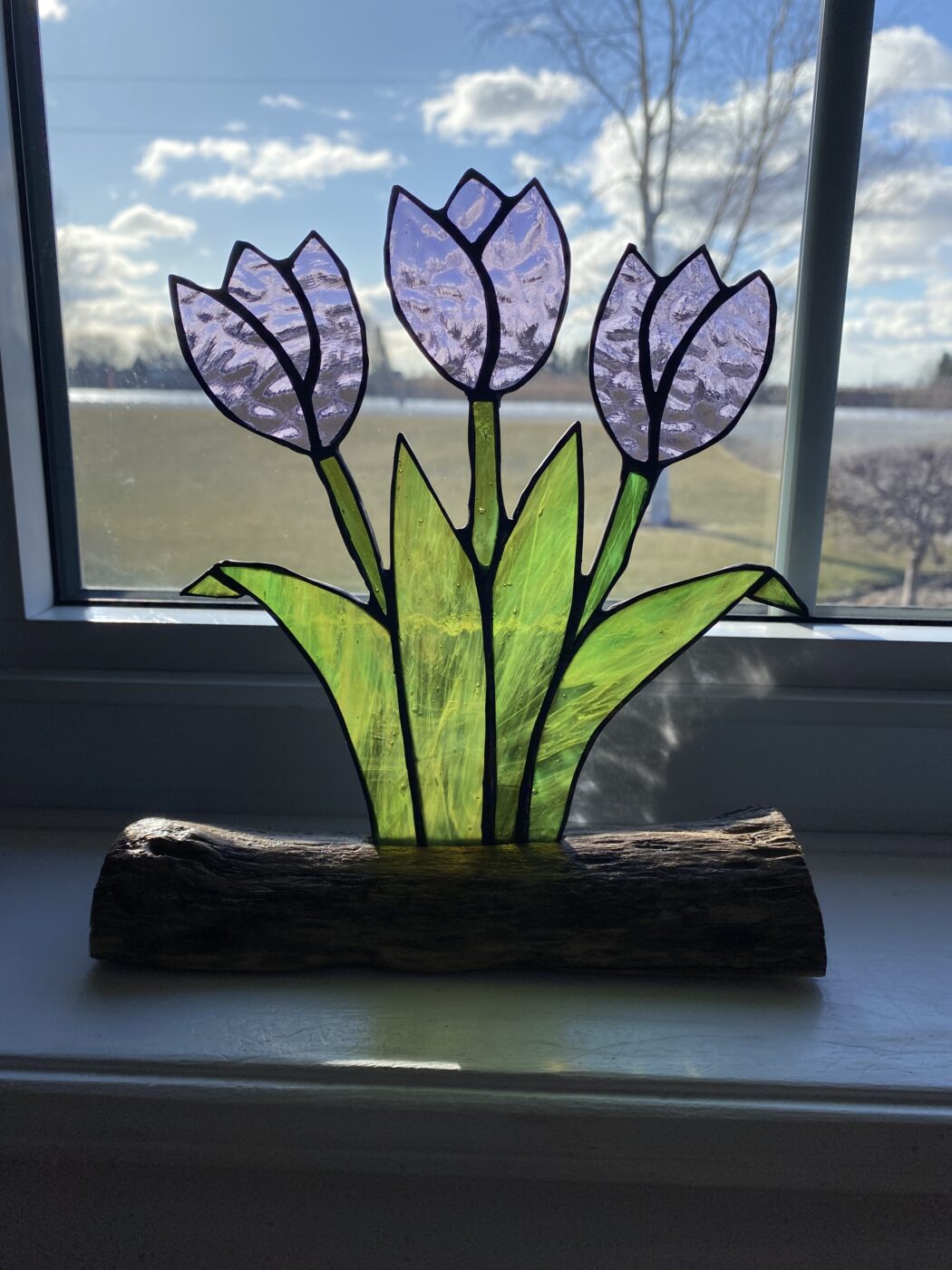 Stained Glass Tulip Flower Bouquet inlaid on driftwood base – Light Purple