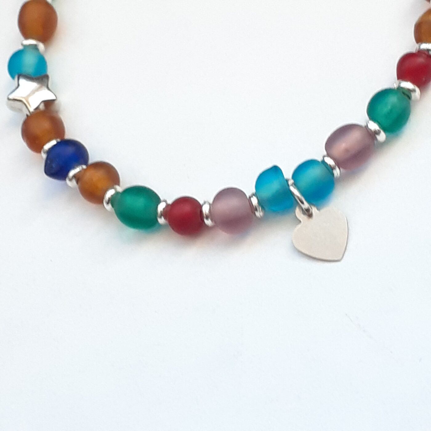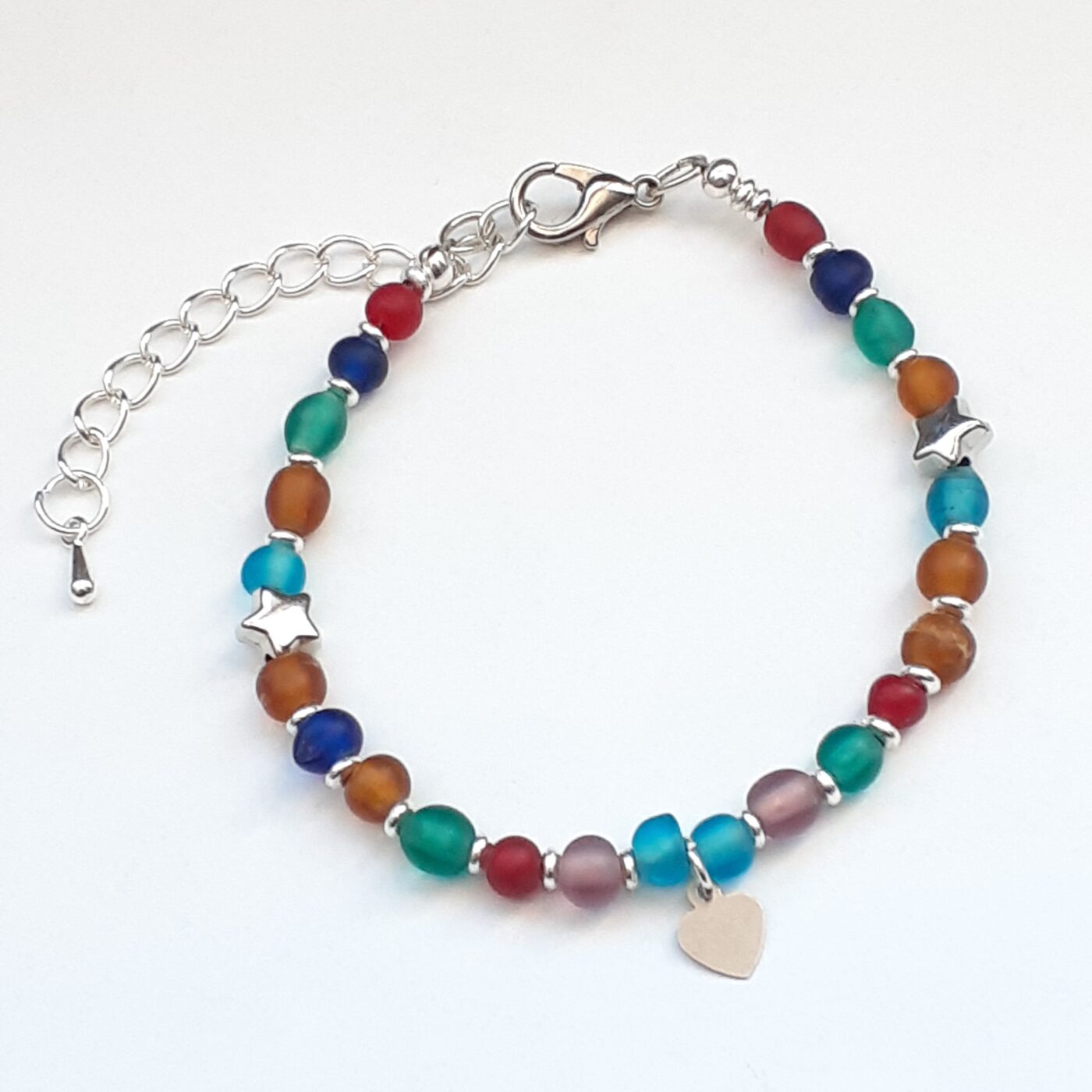 A thin colourful frosted beaded bracelet. Adjustable from 6 to 7 inches. A cute bracelet accented with a tiny heart charm and 2 tiny silver stars. Beautiful, easy wear and a versatile accessory. This lightweight piece featuring mixed colours is ideal for layering. Great for Valentine’s Day gifts.