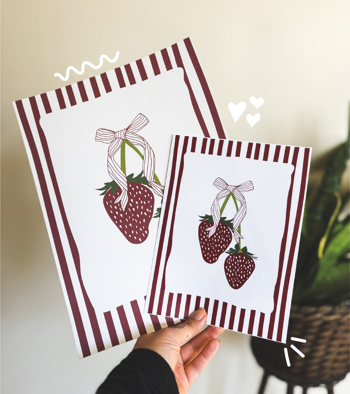 Add a sweet and playful touch to your walls with this Strawberry Bow Art Print. Featuring a charming digital illustration of strawberries tied with a bow against a striped background, this piece is perfect for creating a cozy, aesthetic vibe in your kitchen, dining area, or anywhere you want a pop of colour.