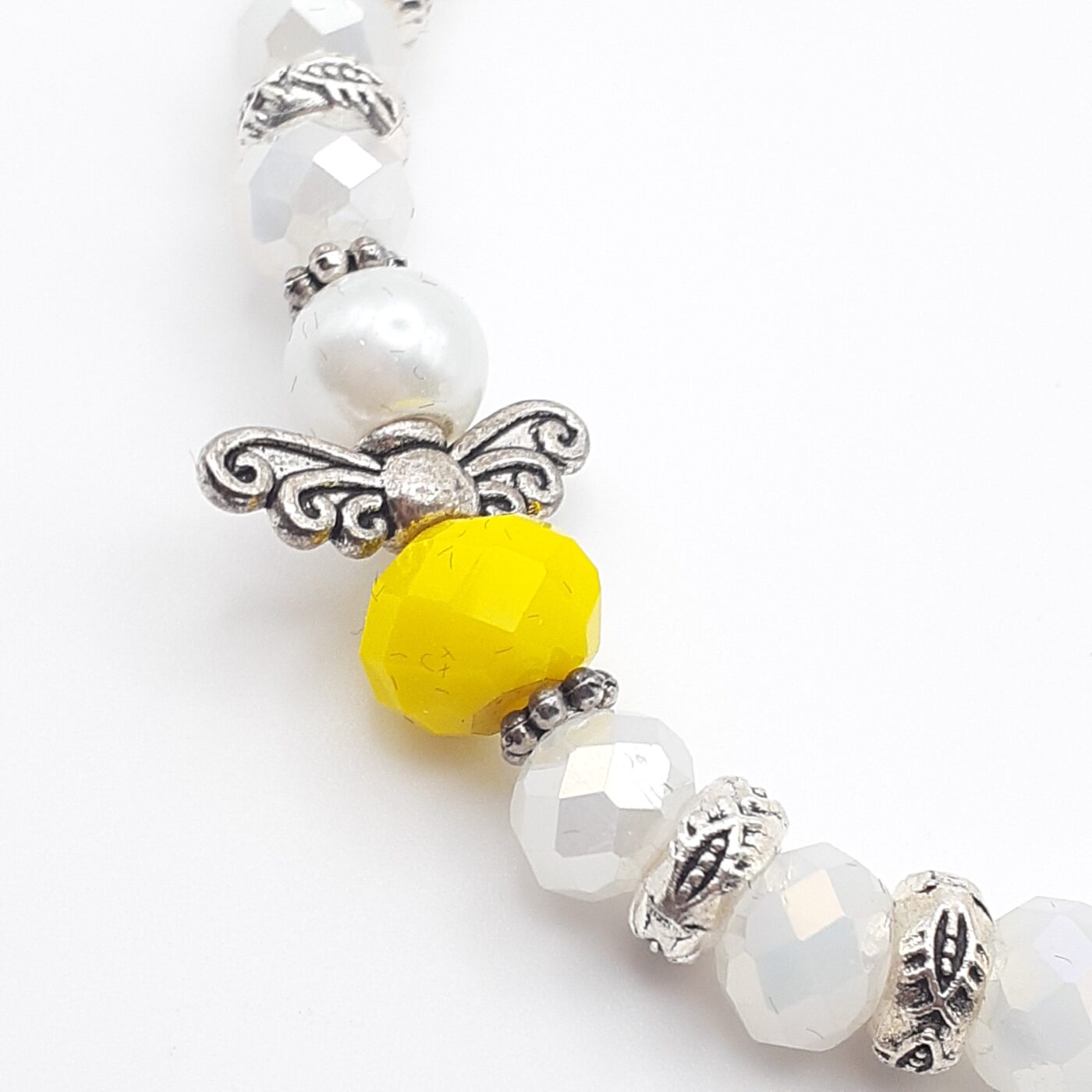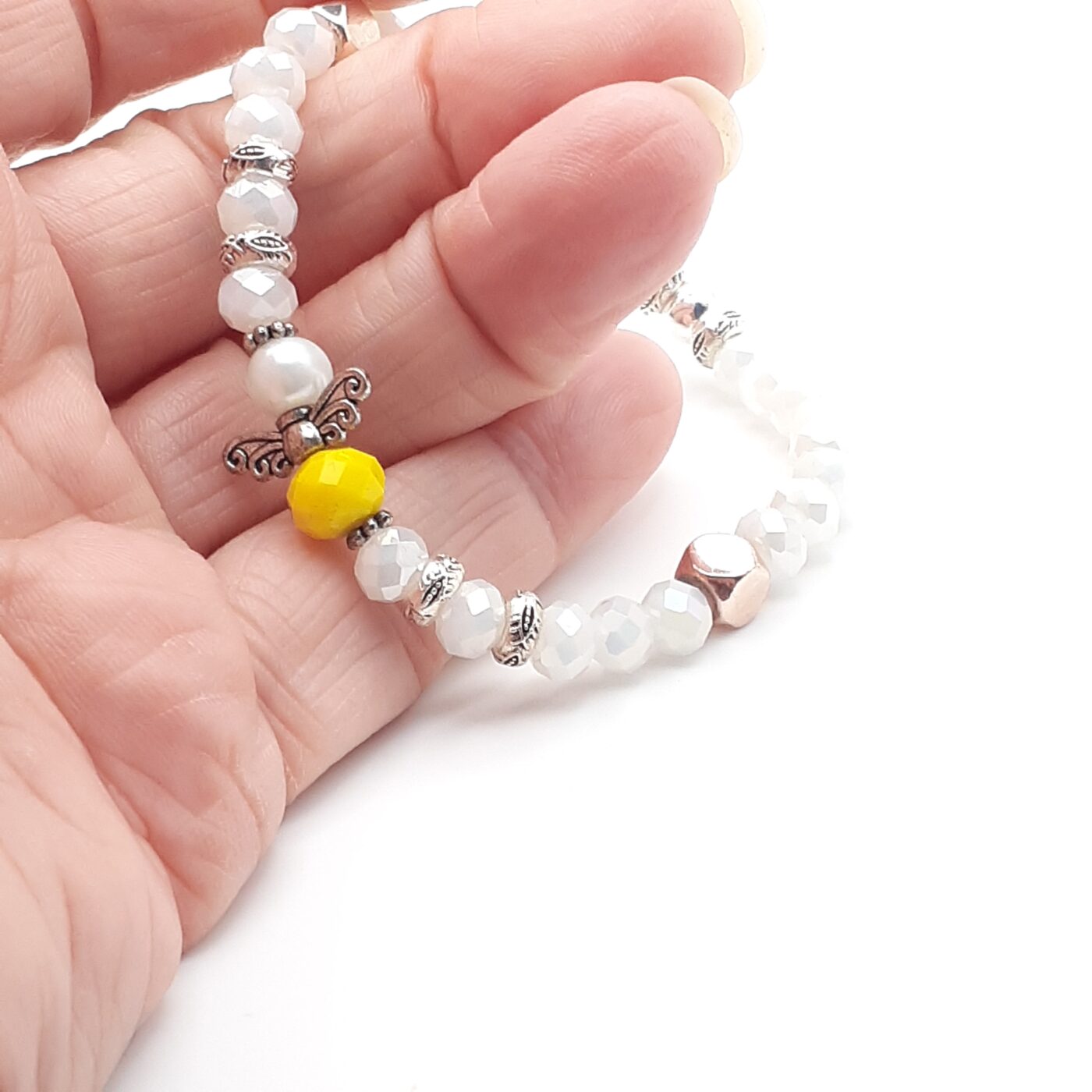 Faceted white crystal glass beads on this stretch-style bracelet offer loads of shimmer on this bracelet. The sunny yellow angel charm adds a vibrant, cheerful contrast. It’s versatile for daily wear, or given as a thoughtful gift for encouragement, birthday, Christmas, or even Valentine’s Day.