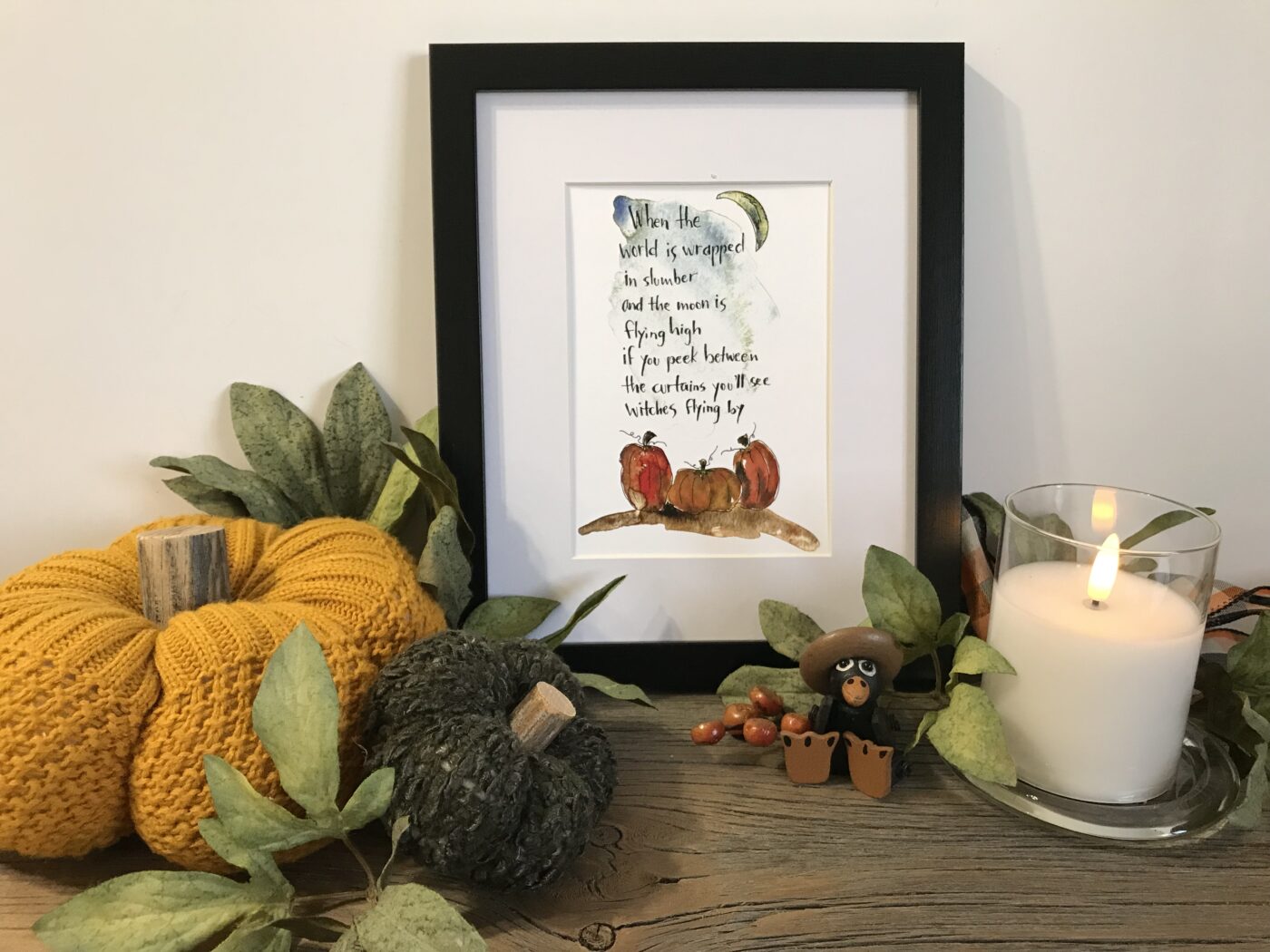 Part of my Autumn Collection. This piece captures the season with a display of pumpkins and the caption: “When the world is wrapped in slumber, and the moon is flying high, if you peek between the curtains, you’ll see witches flying by.” Such a perfect decor piece for the harvest season and beyond. Micron ink pen and watercolour design.