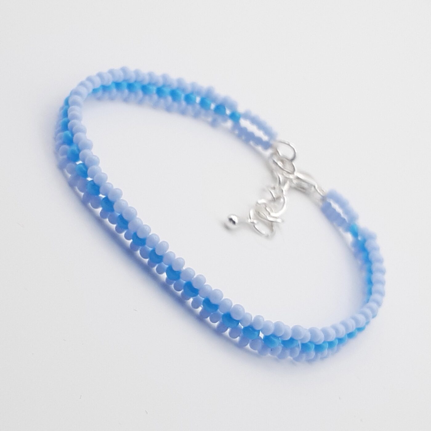 Blue and white Czech seed beads sewn into a handwoven pattern of rows of each colour the length of the bracelet. The bracelet drapes beautifully on your wrist as this type of weaving of the beads give it a supple, very flexible movement. Delicate and dainty both describe well this jewelry accessory. Adjustable from 6.5 – 7 inches.