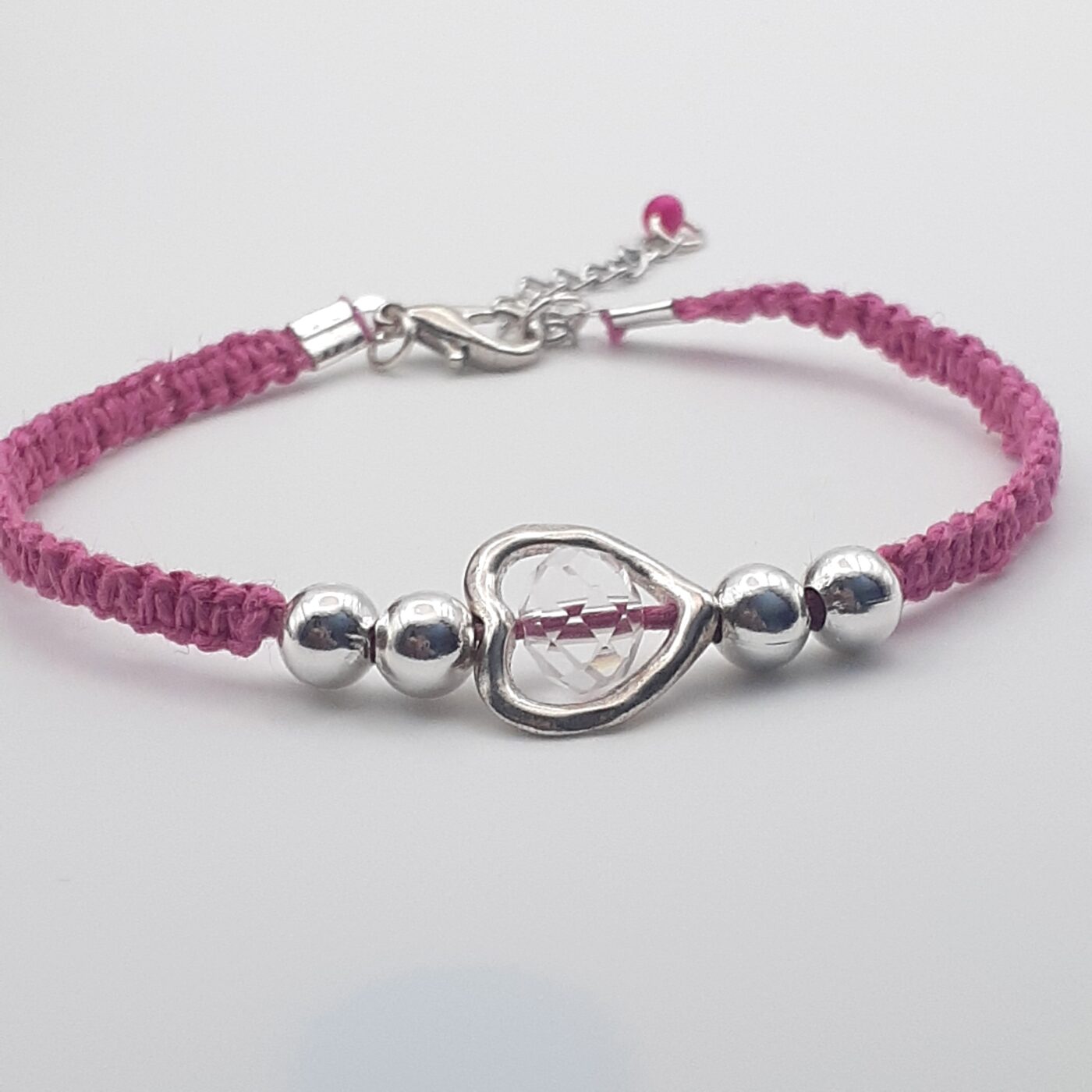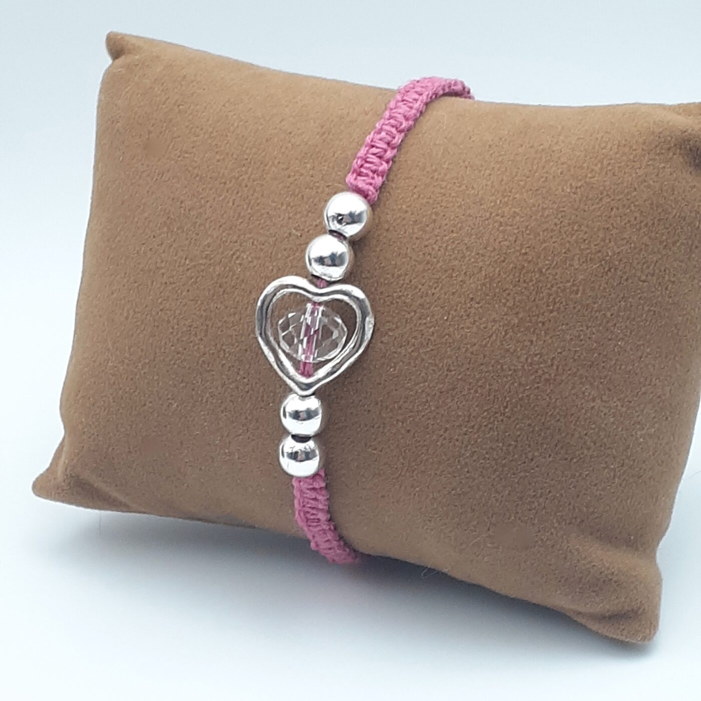Thin Pink Hemp Macrame Bracelet with Open Heart-Shaped Metal Charm with Clear Faceted Crystal