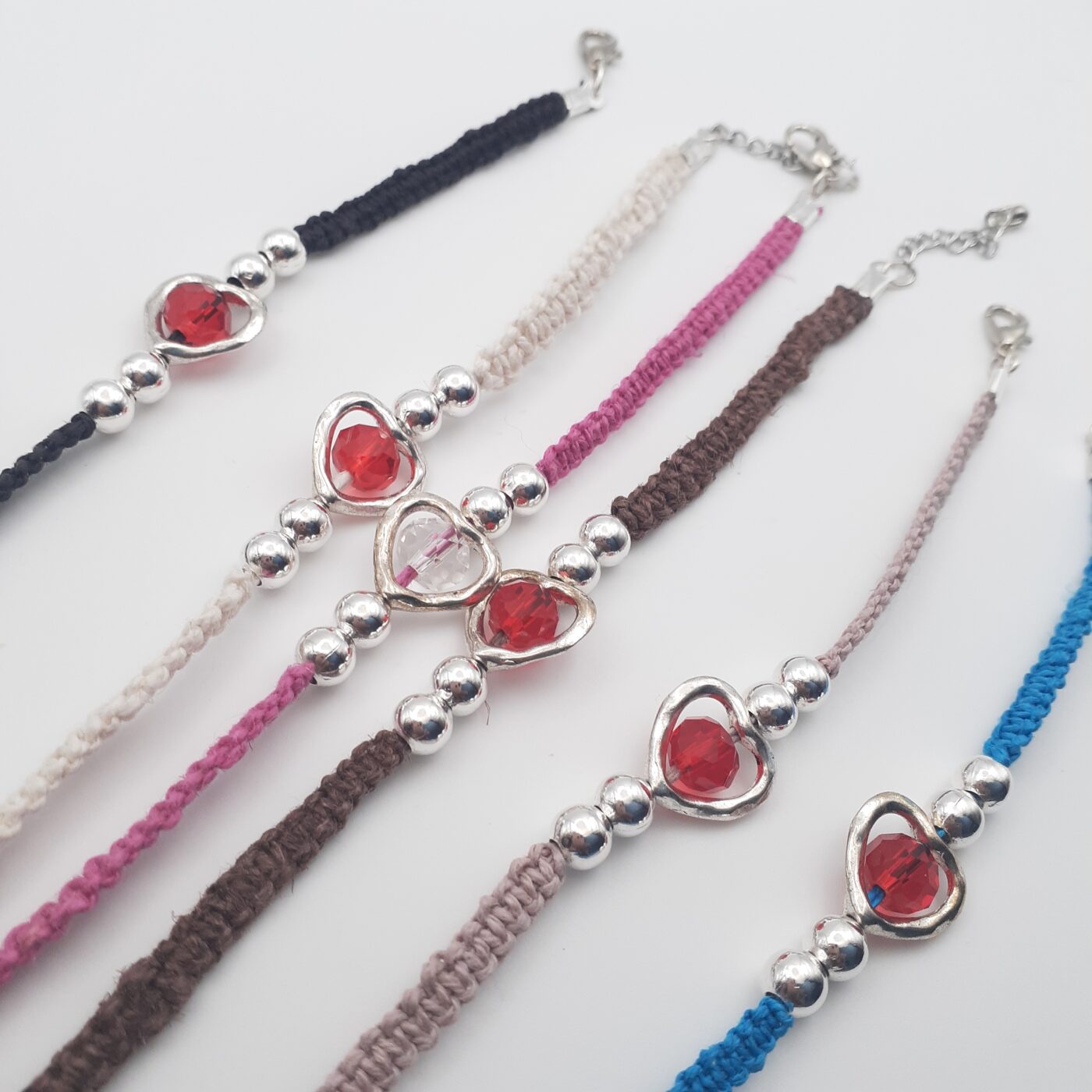 This is a delicate, minimalist and romantic boho-chic style thin hemp cord macrame bracelet. The centerpiece is an open heart-shaped polished metal charm with a clear faceted crystal inside that adds sparkle and sophistication. It is suitable for everyday wear, can be worn alone or stacked with other bracelets. Perfect for Valentine’s Day, anniversaries, birthdays, or as a thoughtful romantic, or, “Galentine’s” gift. Vibrant pink. Lightweight for comfortable all-day wear. Fits 6.5 – 7 inches.