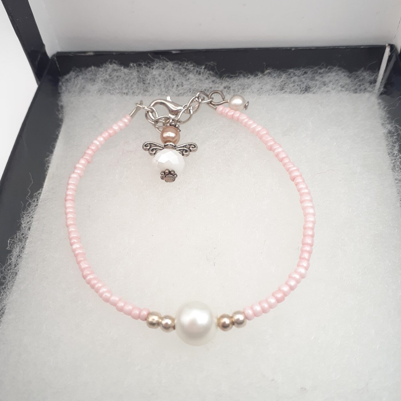 Thin Pink Seed Bead and Pearl Bracelet with an Angel Charm
