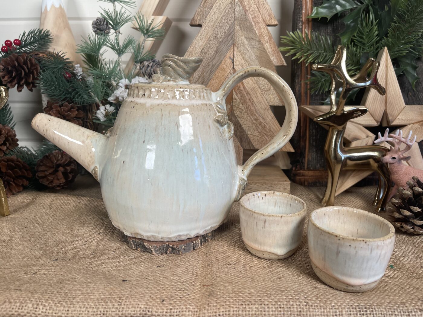 Set includes teapot and two small teacups, approximately 2” tall x 2.5” wide