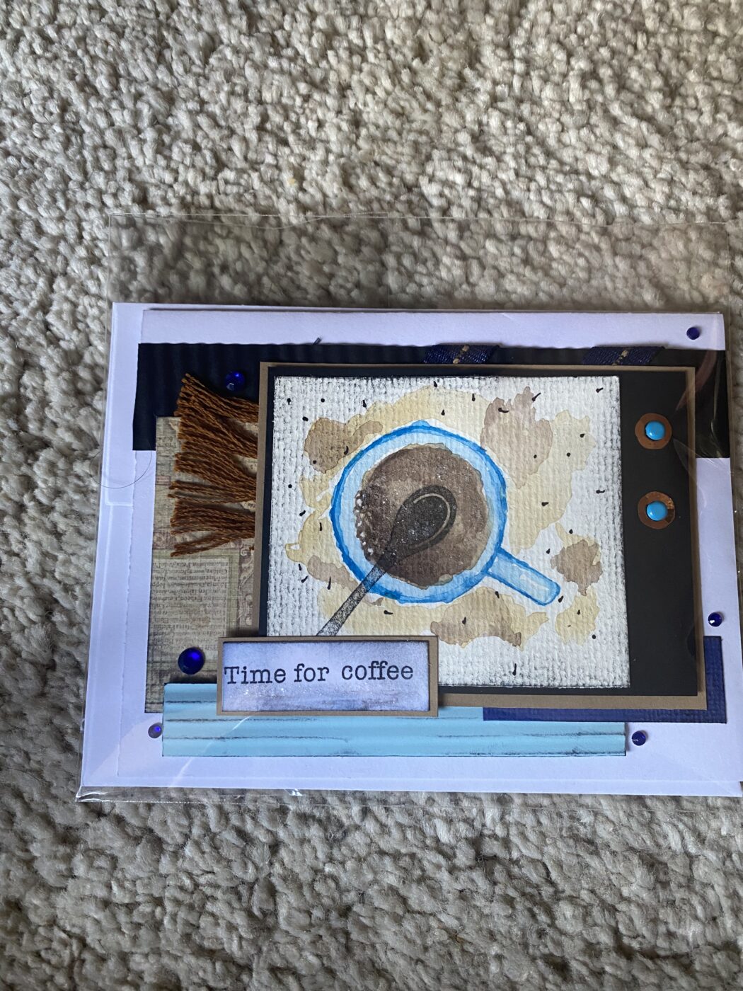 Who needs coffee? This hand-made card uses a combination of mixed media, gem stones, ribbon, and a stamped saying. Printed on quality card stock. Watercolour additions and layers adds to the beauty of this piece. A special way to show someone you care with a piece that was made with care and love. Blank inside so you can customize your own sentiment. Includes an envelope.