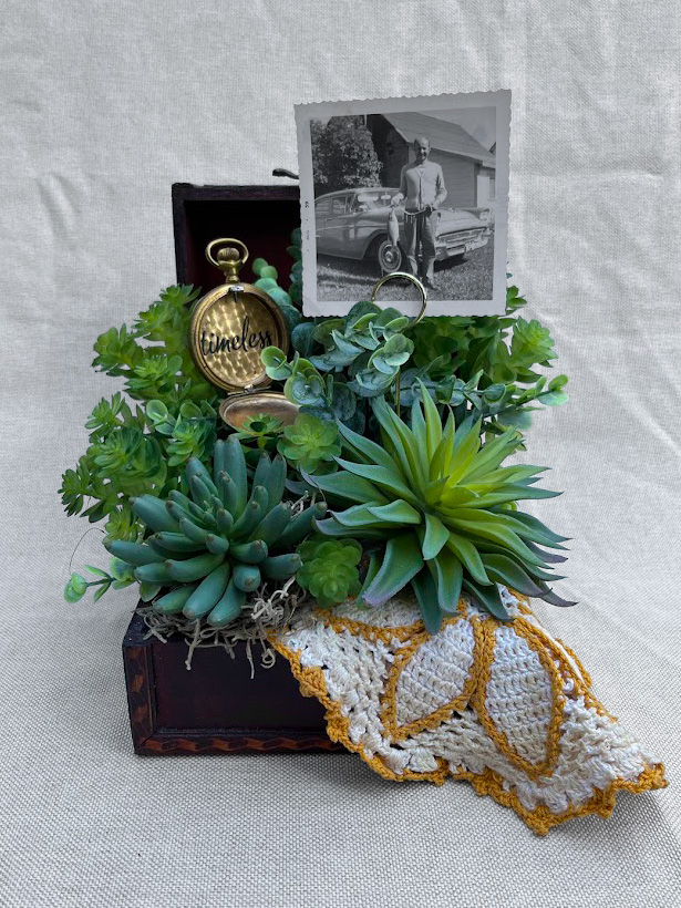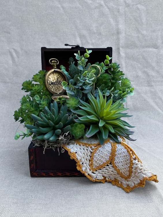 This design is for you. The dark wood box is filled with premium faux succulents and greenery. A vintage time piece and crocheted doily add touches of nostalgia to highlight your special memory. (The metal photo holder shows a sample photo.) Perfectly sized for the book shelf, mantle or dresser.