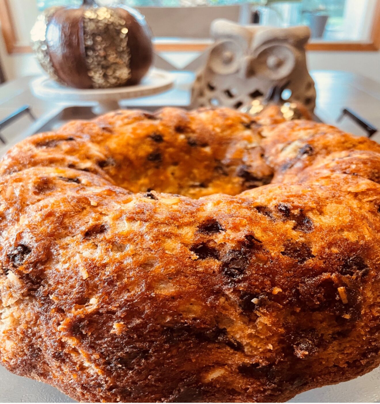 A moist, delicious, homemade tropical banana bread with coconut and chocolate chips. Made in a 9″ round loaf pan.