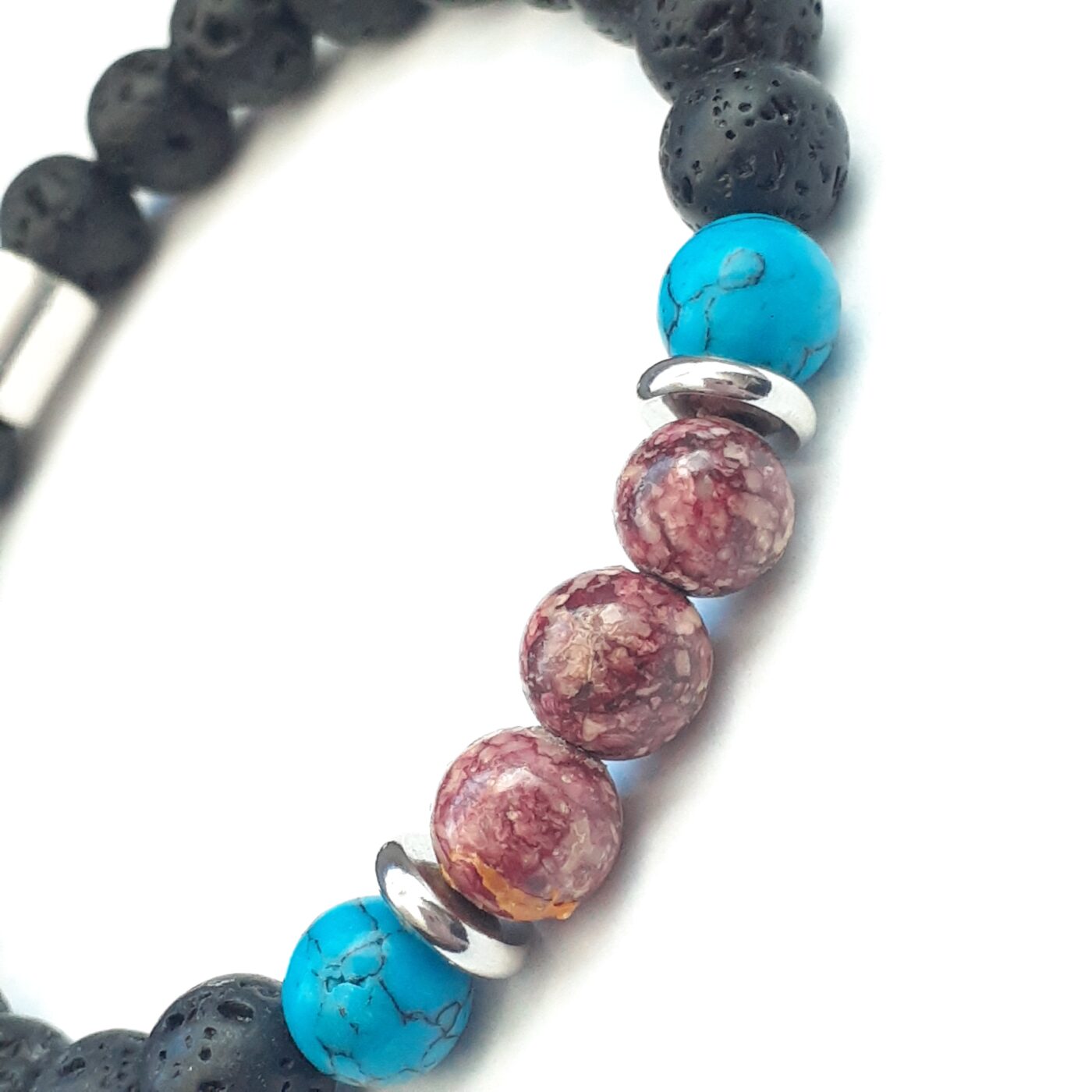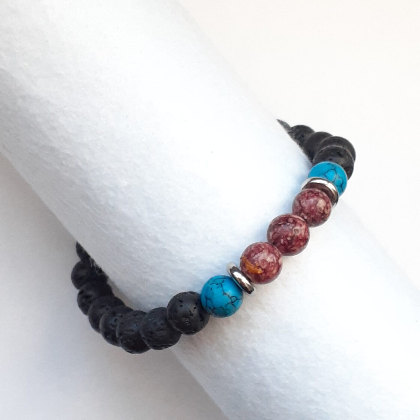 This turquoise howlite and red stone bead lava stretch bracelet can be a popular unisex piece of jewelry, that combines natural porous black volcanic rock, with coloured beads. It is designed for both style and holistic benefits. It’s often used as an essential oil diffuser and for its grounding, calming, and protective properties.The volcanic rock absorbs oils or perfume, releasing fragrance throughout the day. Make sure the oil used is safe for your skin. These bracelets are not just known for their unique rugged beauty, but also for the meanings and benefits they carry. Originating from the very core of the earth, lava rock bracelets symbolize strength, resilience, and connection to Mother Nature, making them much more than simple accessories. The elastic stretch design makes them super easy to slip on and off. Fits wrists 7.5 – 8 inches.