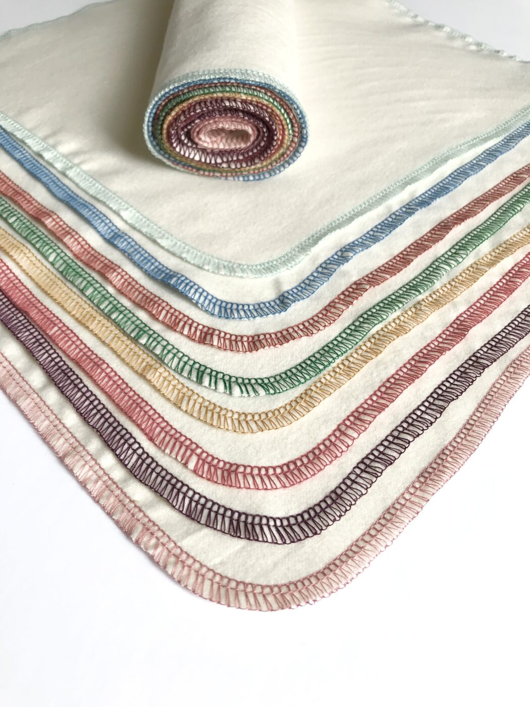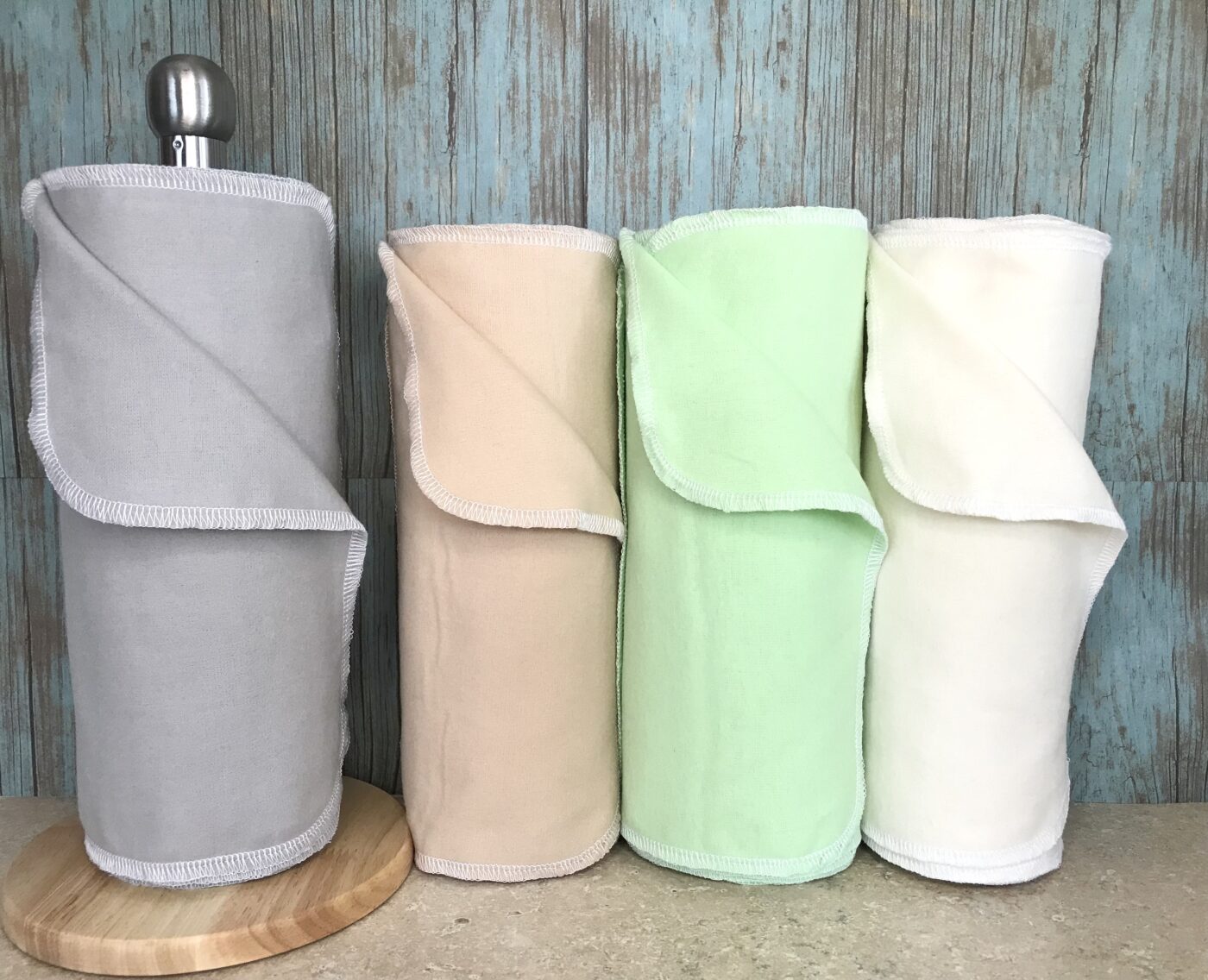 Towels adhere onto each other so it rolls up nicely on a paper towel tube to be used in a towel holder. Or you can keep them in a basket on the kitchen counter. Edges are surged for durability and to prevent fraying. These can be washed and machine dried on warm with your usual washing load and it’s easy to maintain. Use a mild soap and no bleaching agent. Do not use fabric softener for better absorption efficiency. (Unpaper towels are not pre-washed)