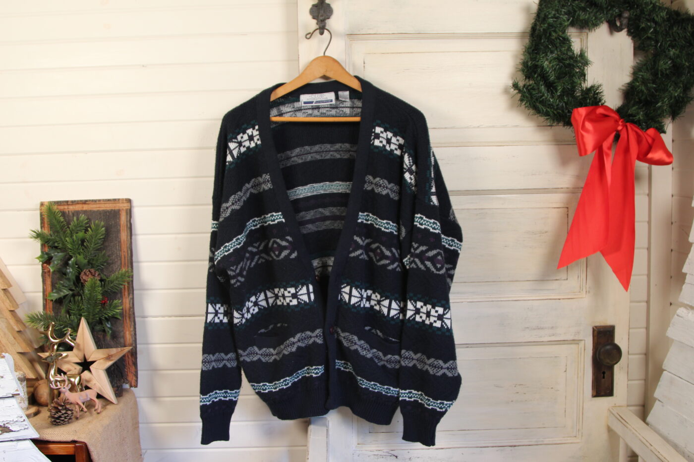 Throw on this second layer to keep warm next to the fire. Navy cardigan with a splashy 80’s pattern. Keeps you seen while you nestle in with a good book and tea.