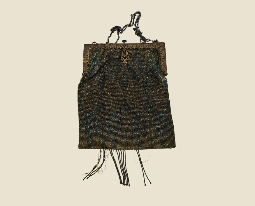This vintage Edwardian Reticule is over 100-years-old. It has steel beads and no lining with a spring clasp.. It measures approixmately 6″ x 7″. Sold as a survivor with some conditions. Great to use as a display.