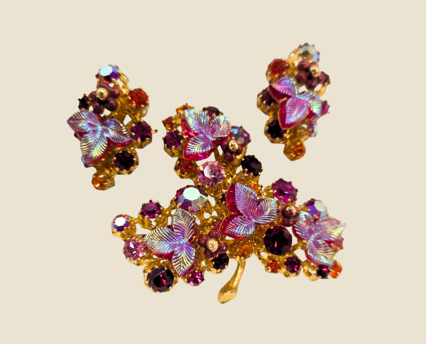 This vintage triad brooch & earring set features coloured and aurora borealis rhinestones and patterned glass leaves. The rhinestones are prong-set. All are in excellent condition.