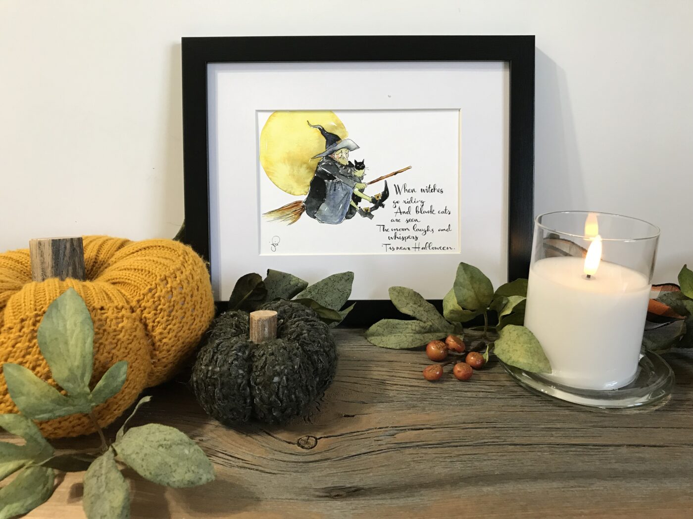 Part of my Halloween Collection. This piece captures the spirit of Halloween with a rickety old witch flying on her broom into the moonlit sky. The spooky message fits so perfectly: “When witches go riding, and black cats are seen, the moon laughs and whispers, ’tis near Halloween.”  A great decor piece for the mystical season and beyond. Micron ink pen and watercolour design.