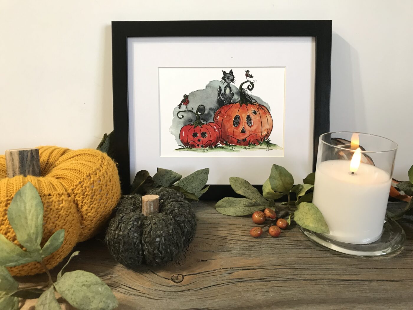 Part of my Halloween Collection. This piece captures the spirit of Halloween with a mysterious black cat sitting upon a cute pumpkin in a pumpkin patch.  Such a perfect decor piece for the mystical season and beyond. Micron ink pen and watercolour design.